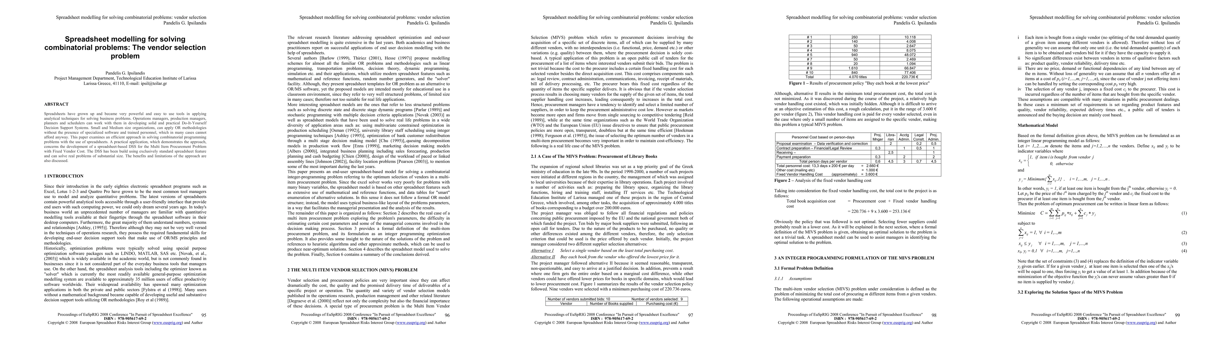 This paper explores using spreadsheets to solve combinatorial programming problems, specifically the Multi Item Procurement Problem with Fixed Vendor Cost. It demonstrates a practical, spreadsheet-based Decision Support System (DSS) that can handle substantial problem sizes without specialized software, highlighting benefits and limitations of this approach.
