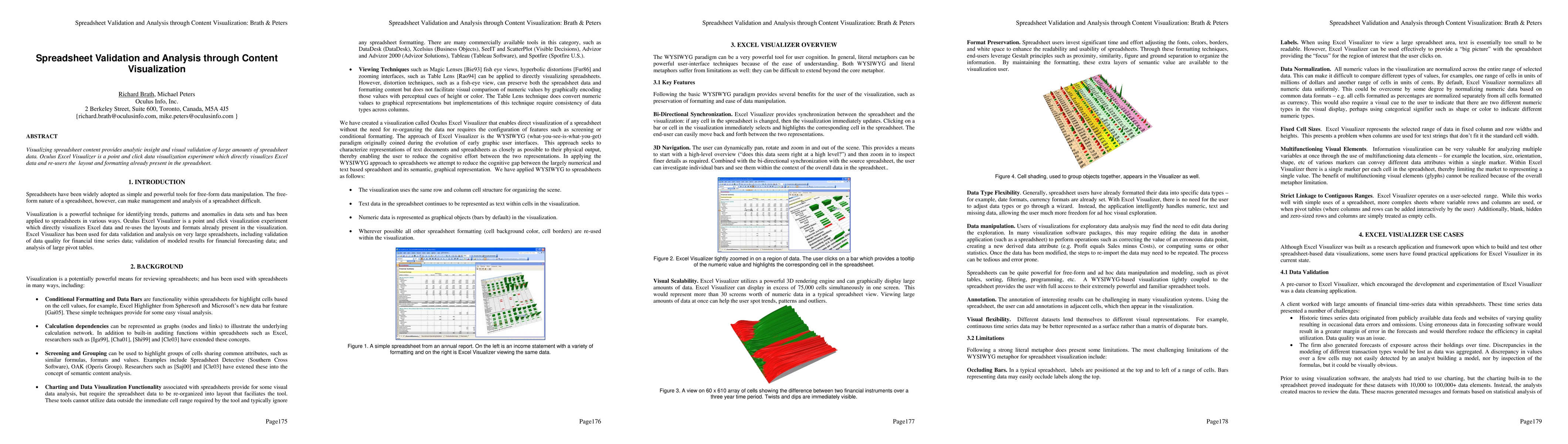 Visualizing spreadsheet content provides analytic insight and visual validation of large amounts of spreadsheet data. Oculus Excel Visualizer is a point and click data visualization experiment which directly visualizes Excel data and re-uses the layout and formatting already present in the spreadsheet.