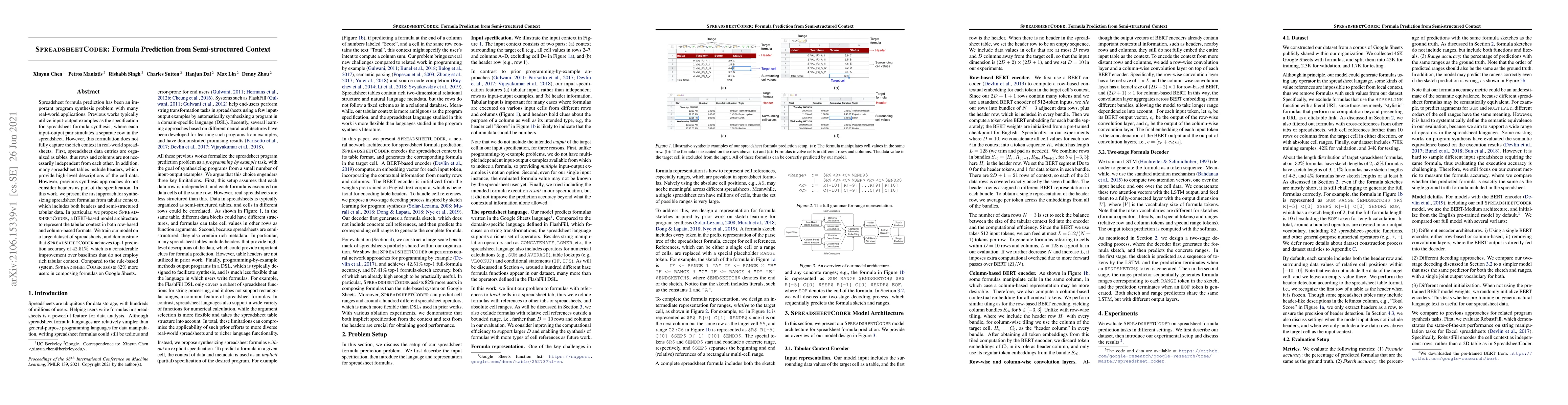 Researchers introduced SpreadsheetCoder, a BERT-based model that predicts spreadsheet formulas from tabular context, achieving top-1 accuracy of 42.51%.