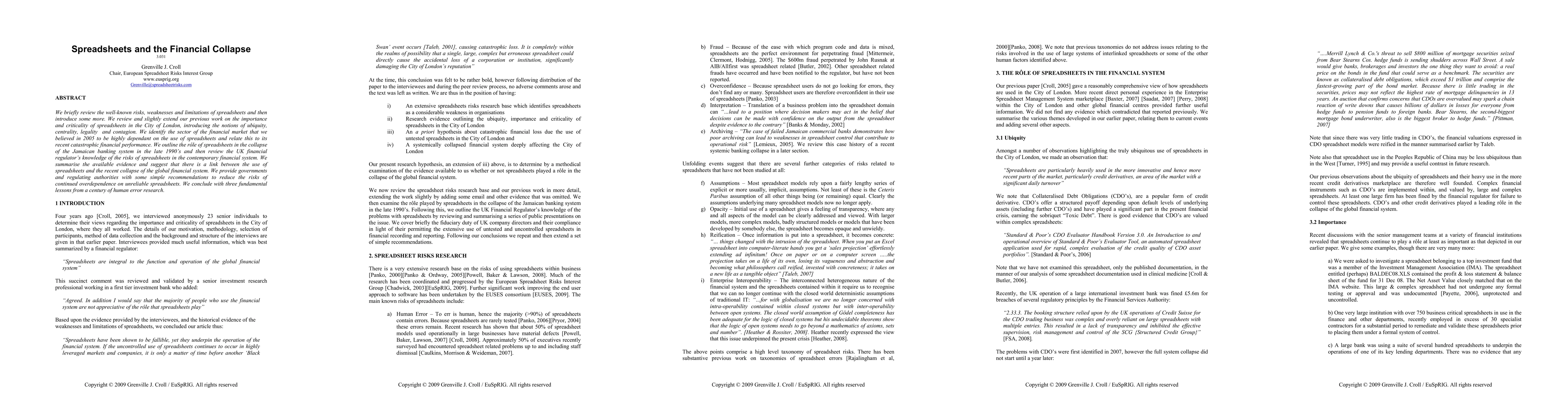 This paper examines the risks and limitations of spreadsheets, highlighting their critical role in financial collapses, including the recent global financial crisis and the Jamaican banking system's failure. It provides recommendations for regulators to mitigate these risks and concludes with lessons from a century of human error research.