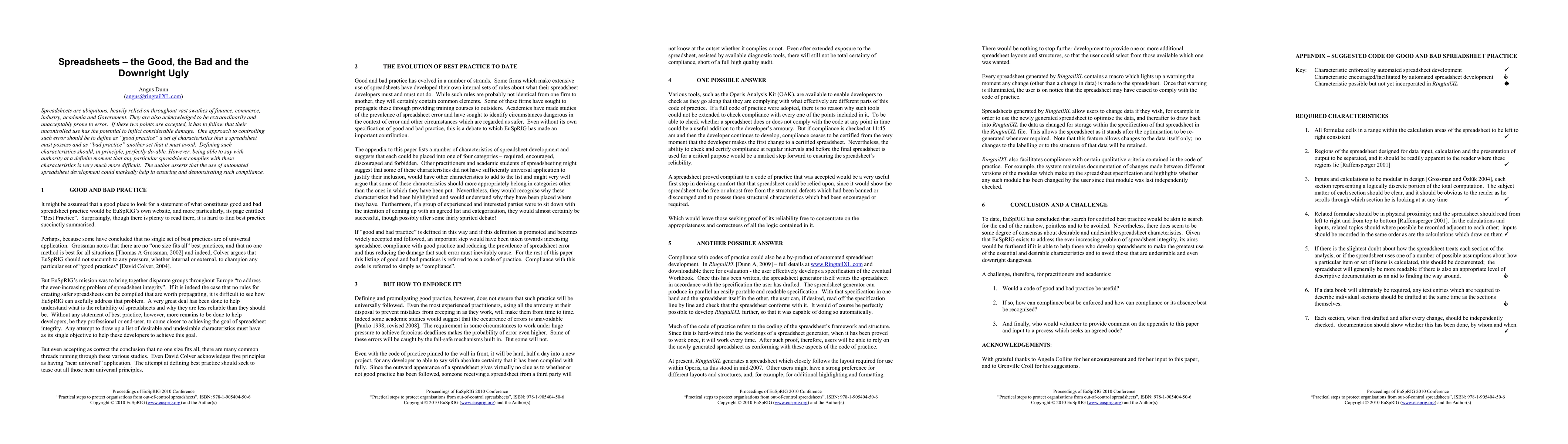 Spreadsheets are ubiquitous, heavily relied on throughout vast swathes of finance, commerce, industry, academia and Government. They are also acknowledged to be extraordinarily and unacceptably prone to error. If these two points are accepted, it has to follow that their uncontrolled use has the potential to inflict considerable damage. One approach to controlling such error should be to define as "good practice" a set of characteristics that a spreadsheet must possess and as "bad practice" another set that it must avoid. Defining such characteristics should, in principle, perfectly do-able. However, being able to say with authority at a definite moment that any particular spreadsheet complies with these characteristics is very much more difficult. The author asserts that the use of automated spreadsheet development could markedly help in ensuring and demonstrating such compliance.