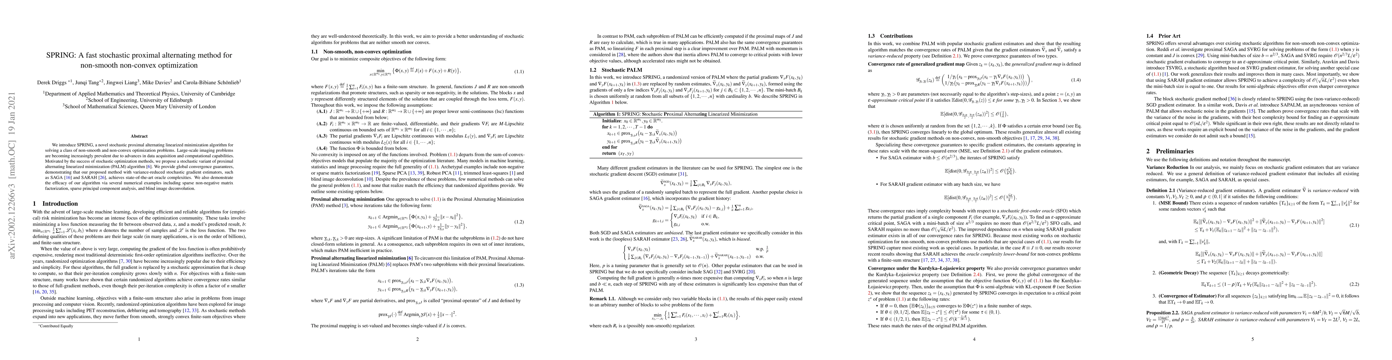 SPRING is a fast stochastic proximal alternating method for solving non-smooth, non-convex optimization problems, achieving state-of-the-art oracle complexities with global convergence guarantees. The method is demonstrated through applications in sparse non-negative matrix factorization, sparse PCA, and blind image deconvolution.