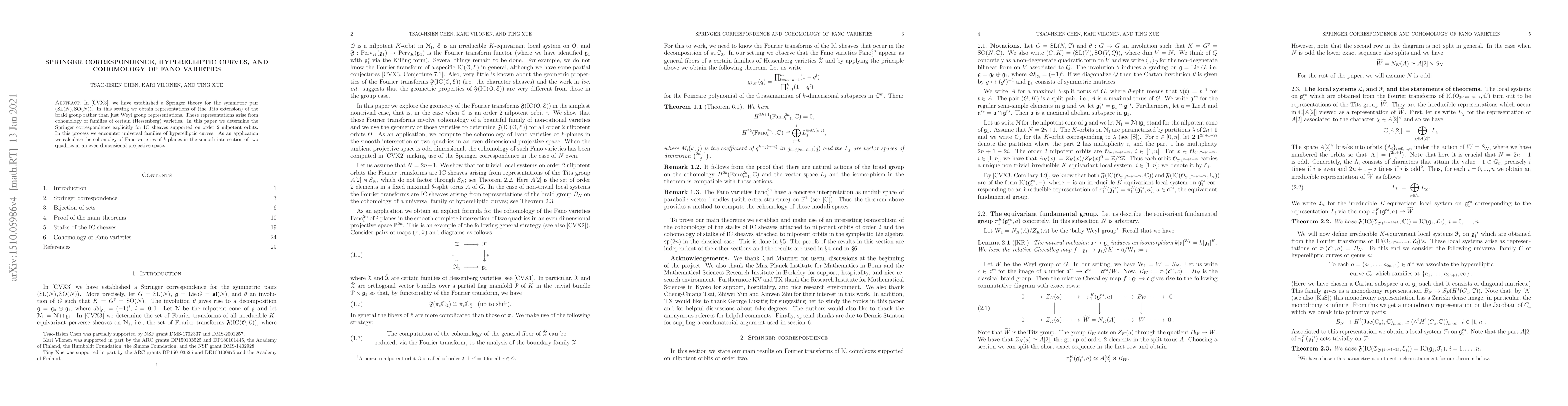 In \cite{CVX3}, we have established a Springer theory for the symmetric pair $(\operatorname{SL}(N),\operatorname{SO}(N))$. In this setting we obtain representations of (the Tits extension) of the braid group rather than just Weyl group representations. These representations arise from cohomology of families of certain (Hessenberg) varieties. In this paper we determine the Springer correspondence explicitly for IC sheaves supported on order 2 nilpotent orbits. In this process we encounter universal families of hyperelliptic curves. As an application we calculate the cohomolgy of Fano varieties of $k$-planes in the smooth intersection of two quadrics in an even dimensional projective space.