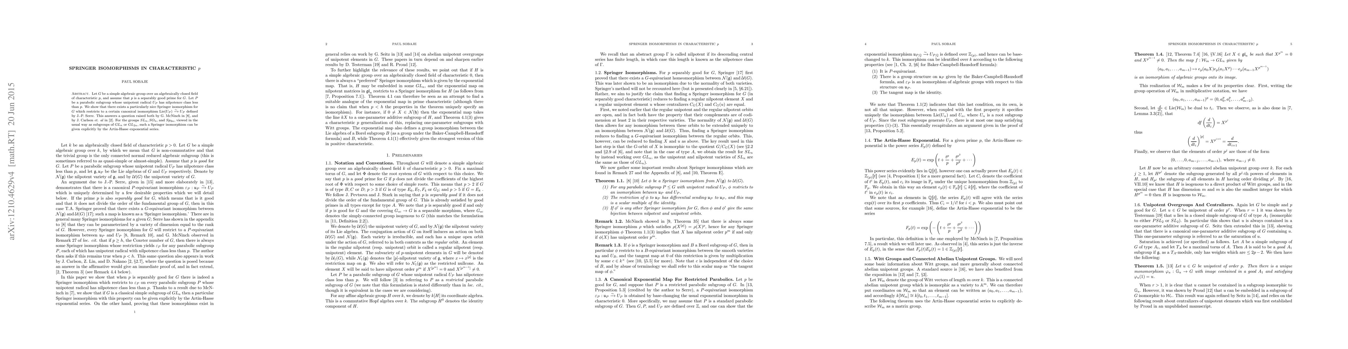 Let $G$ be a simple algebraic group over an algebraically closed field of characteristic $p$, and assume that $p$ is a very good prime for $G$. Let $P$ be a parabolic subgroup whose unipotent radical $U_P$ has nilpotence class less than $p$. We show that there exists a particularly nice Springer isomorphism for $G$ which restricts to a certain canonical isomorphism $\text{Lie}(U_P) \xrightarrow{\sim} U_P$ defined by J.-P. Serre. This answers a question raised both by G. McNinch in \cite{M2}, and by J. Carlson \textit{et. al} in \cite{CLN}. For the groups $SL_n, SO_n$, and $Sp_{2n}$, viewed in the usual way as subgroups of $GL_n$ or $GL_{2n}$, such a Springer isomorphism can be given explicitly by the Artin-Hasse exponential series.