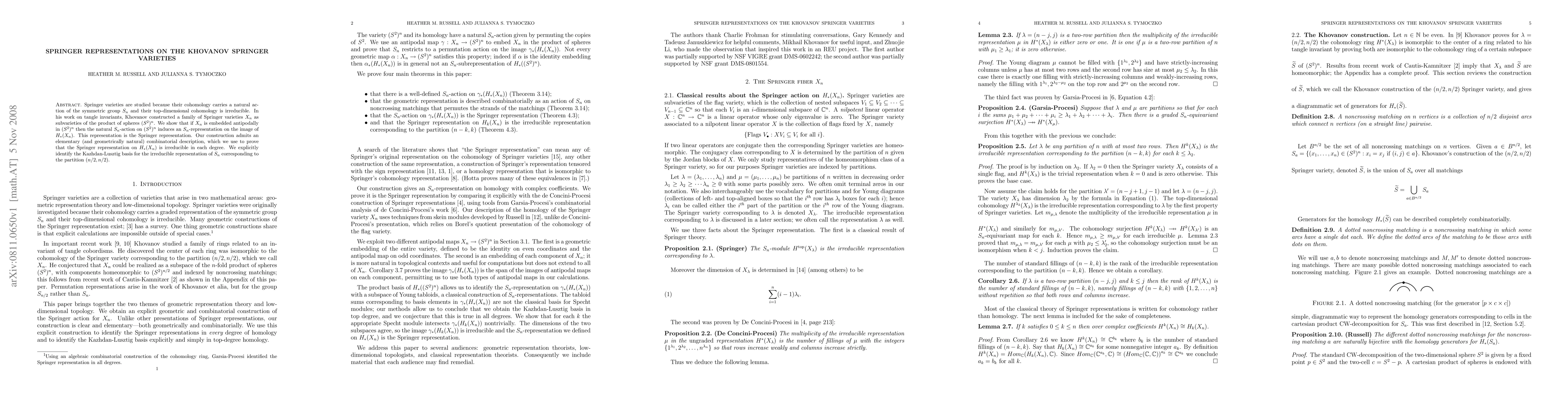 Springer varieties are studied because their cohomology carries a natural action of the symmetric group $S_n$ and their top-dimensional cohomology is irreducible. In his work on tangle invariants, Khovanov constructed a family of Springer varieties $X_n$ as subvarieties of the product of spheres $(S^2)^n$. We show that if $X_n$ is embedded antipodally in $(S^2)^n$ then the natural $S_n$-action on $(S^2)^n$ induces an $S_n$-representation on the image of $H_*(X_n)$. This representation is the Springer representation. Our construction admits an elementary (and geometrically natural) combinatorial description, which we use to prove that the Springer representation on $H_*(X_n)$ is irreducible in each degree. We explicitly identify the Kazhdan-Lusztig basis for the irreducible representation of $S_n$ corresponding to the partition $(n/2,n/2)$.