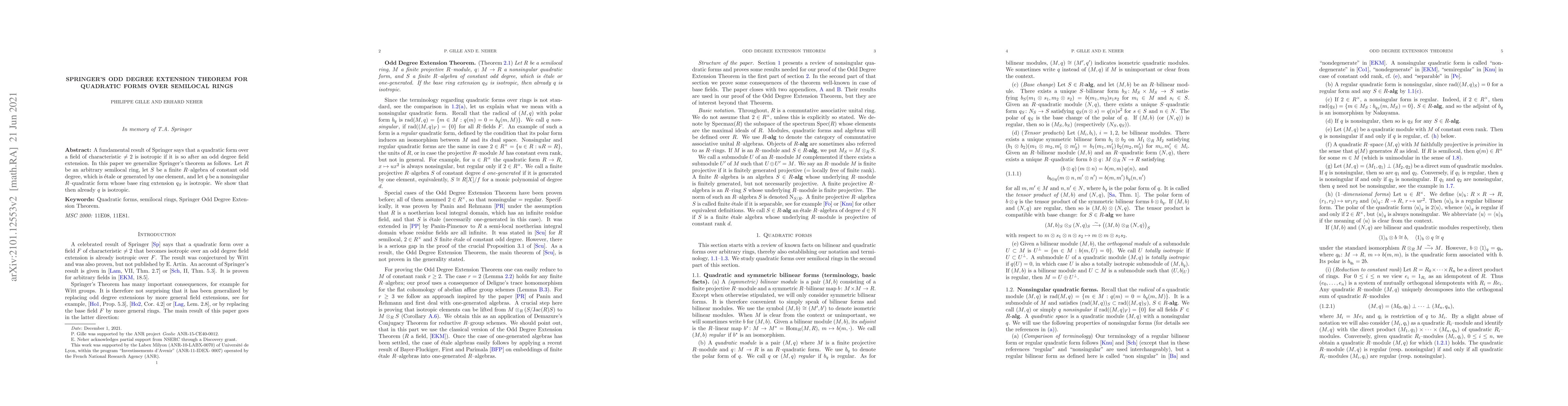 Summary: This paper generalizes Springer's theorem on quadratic forms, proving that if a nonsingular quadratic form over a semilocal ring remains isotropic after an odd degree extension by a finite, étale, or single-element generated algebra, it is already isotropic over the original ring.