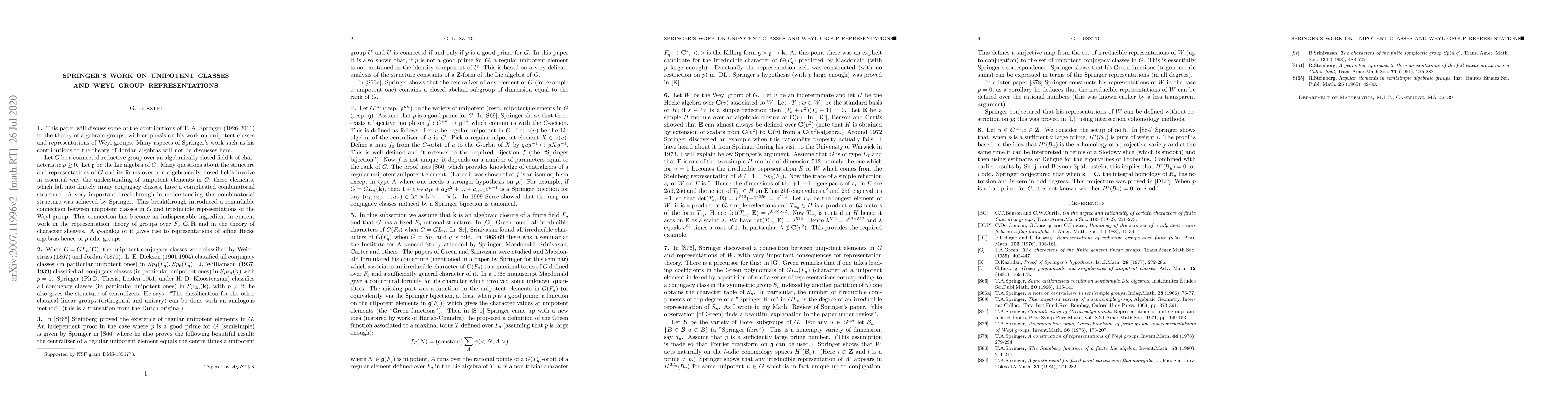 Springer's research explores unipotent classes in reductive groups and Weyl group representations, including his bijection between unipotent and nilpotent varieties and the nonrationality of some Hecke algebra representations.