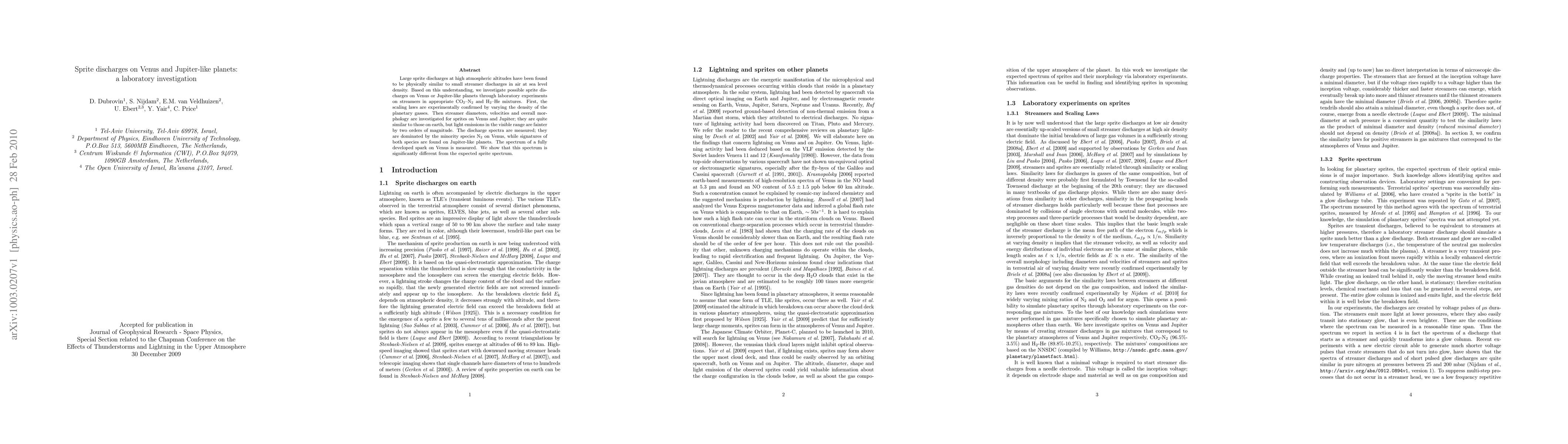 This paper investigates sprite discharges on Venus and Jupiter-like planets using laboratory experiments on streamers in CO2-N2 and H2-He gas mixtures. The study finds that while sprites on these planets exhibit similar morphology to those on Earth, their visible light emissions are much fainter, and their spectra are dominated by different gas species.