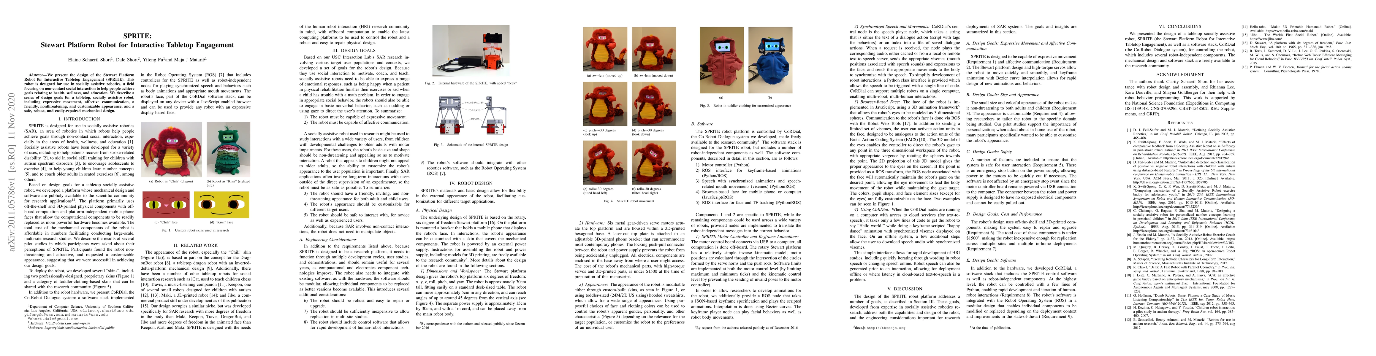 The SPRITE robot, designed for socially assistive robotics, aims to facilitate non-contact social interactions for health, wellness, and education. It features expressive movement, affective communication, and a customizable, safe, and repairable design.