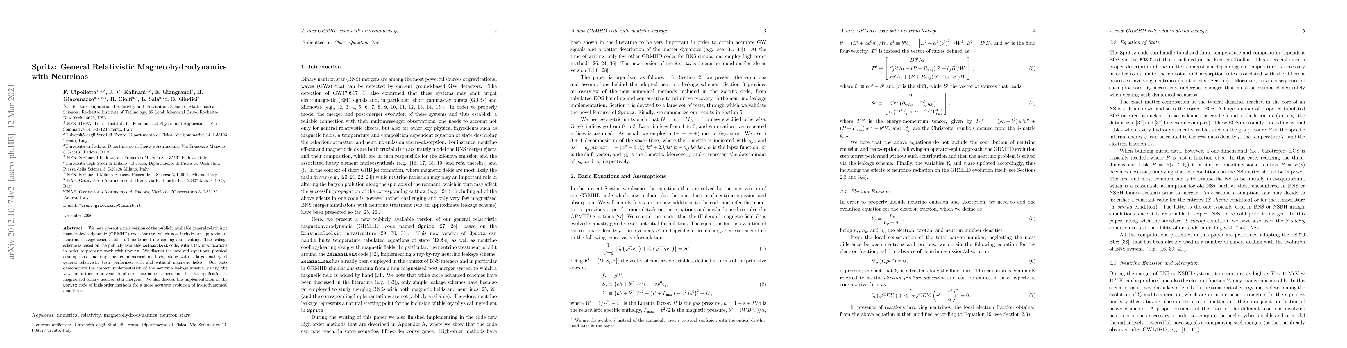We here present a new version of the publicly available general relativistic magnetohydrodynamic (GRMHD) code $\texttt{Spritz}$, which now includes an approximate neutrino leakage scheme able to handle neutrino cooling and heating. The leakage scheme is based on the publicly available $\texttt{ZelmaniLeak}$ code, with a few modifications in order to properly work with $\texttt{Spritz}$. We discuss the involved equations, physical assumptions, and implemented numerical methods, along with a large battery of general relativistic tests performed with and without magnetic fields. Our tests demonstrate the correct implementation of the neutrino leakage scheme, paving the way for further improvements of our neutrino treatment and the first application to magnetized binary neutron star mergers. We also discuss the implementation in the $\texttt{Spritz}$ code of high-order methods for a more accurate evolution of hydrodynamical quantities.