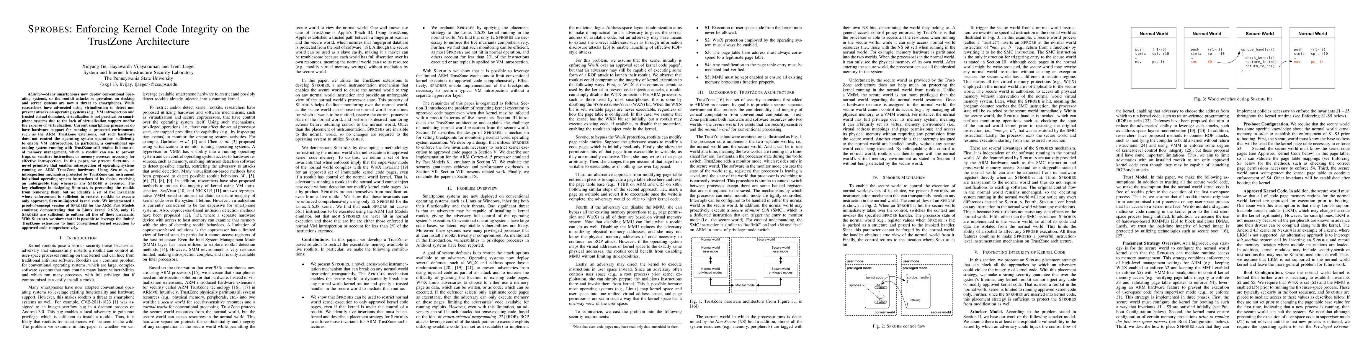 Many smartphones now deploy conventional operating systems, so the rootkit attacks so prevalent on desktop and server systems are now a threat to smartphones. While researchers have advocated using virtualization to detect and prevent attacks on operating systems (e.g., VM introspection and trusted virtual domains), virtualization is not practical on smartphone systems due to the lack of virtualization support and/or the expense of virtualization. Current smartphone processors do have hardware support for running a protected environment, such as the ARM TrustZone extensions, but such hardware does not control the operating system operations sufficiently to enable VM introspection. In particular, a conventional operating system running with TrustZone still retains full control of memory management, which a rootkit can use to prevent traps on sensitive instructions or memory accesses necessary for effective introspection. In this paper, we present SPROBES, a novel primitive that enables introspection of operating systems running on ARM TrustZone hardware. Using SPROBES, an introspection mechanism protected by TrustZone can instrument individual operating system instructions of its choice, receiving an unforgeable trap whenever any SPROBE is executed. The key challenge in designing SPROBES is preventing the rootkit from removing them, but we identify a set of five invariants whose enforcement is sufficient to restrict rootkits to execute only approved, SPROBE-injected kernel code. We implemented a proof-of-concept version of SPROBES for the ARM Fast Models emulator, demonstrating that in Linux kernel 2.6.38, only 12 SPROBES are sufficient to enforce all five of these invariants. With SPROBES we show that it is possible to leverage the limited TrustZone extensions to limit conventional kernel execution to approved code comprehensively.