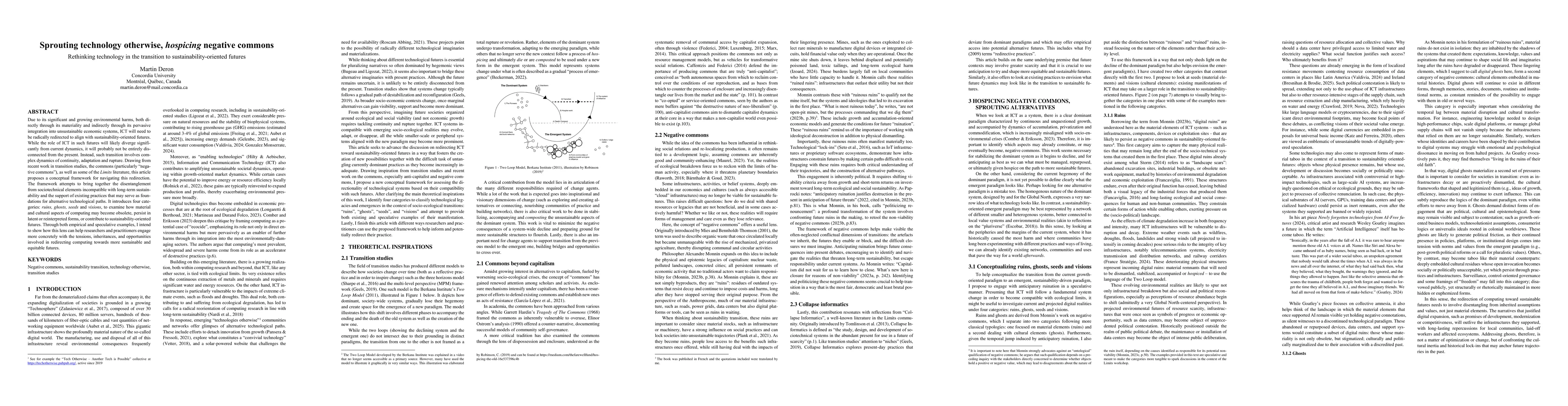 Due to its significant and growing environmental harms, both directly through its materiality and indirectly through its pervasive integration into unsustainable economic systems, ICT will need to be radically redirected to align with sustainability-oriented futures. While the role of ICT in such futures will likely diverge significantly from current dynamics, it will probably not be entirely disconnected from the present. Instead, such transition involves complex dynamics of continuity, adaptation and rupture. Drawing from recent work in transition studies, the commons (particularly "negative commons"), as well as some of the Limits literature, this article proposes a conceptual framework for navigating this redirection. The framework attempts to bring together the disentanglement from sociotechnical elements incompatible with long-term sustainability and the support of existing practices that may serve as foundations for alternative technological paths. It introduces four categories: ruins, ghosts, seeds and visions, to examine how material and cultural aspects of computing may become obsolete, persist in latent or reinterpreted forms, or contribute to sustainability-oriented futures. Through both empirical and speculative examples, I intend to show how this lens can help researchers and practitioners engage more concretely with the tensions, inheritances, and opportunities involved in redirecting computing towards more sustainable and equitable futures.