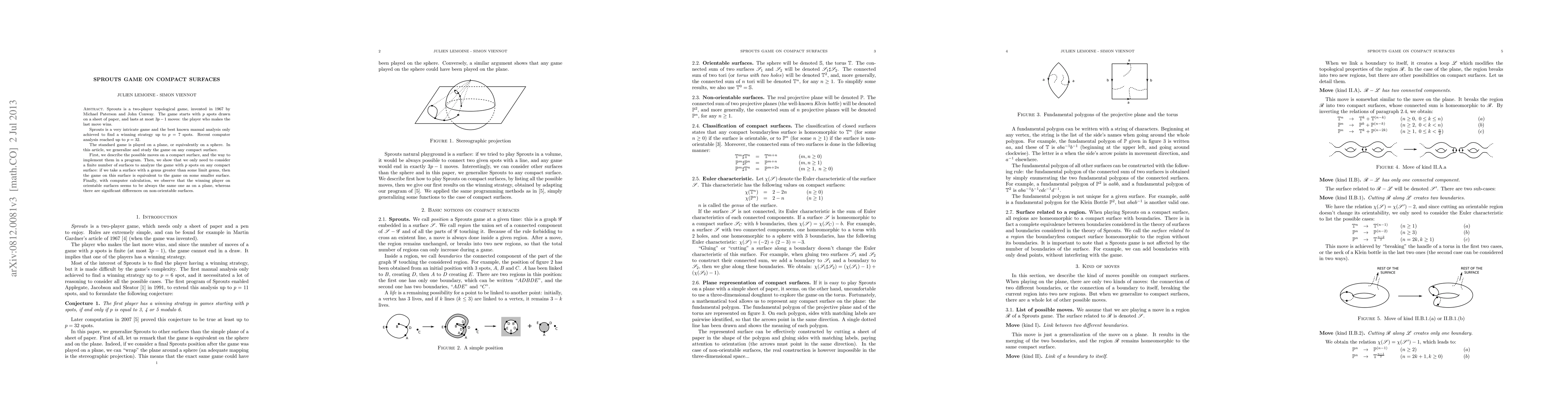 This paper generalizes the topological game "Sprouts" to any compact surface, detailing the moves and computational strategies for analysis. It finds that while the winning player on orientable surfaces mirrors that on a plane, non-orientable surfaces exhibit significant differences in winning strategies.