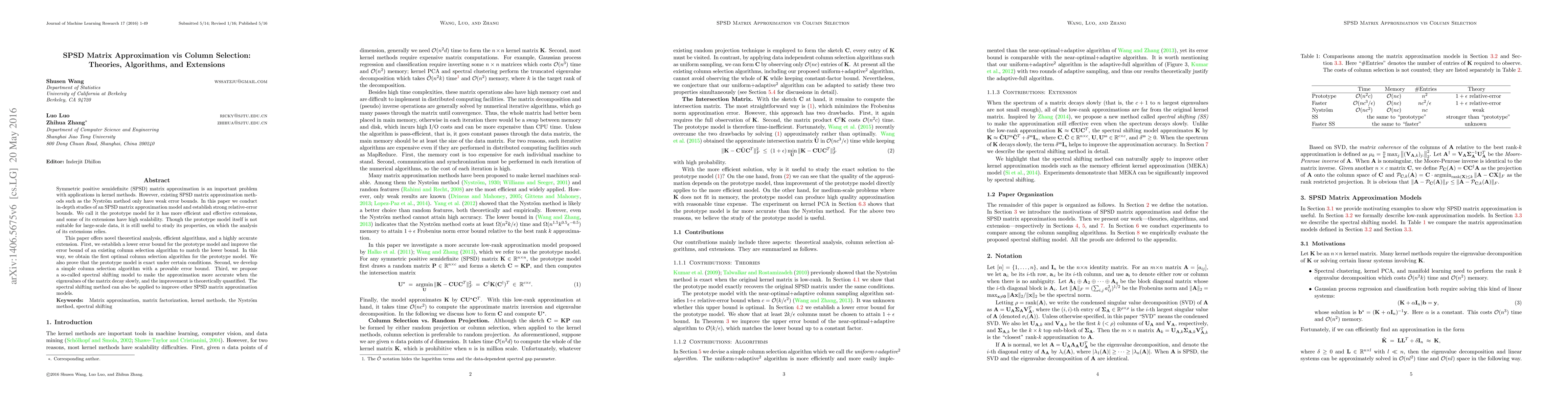 This paper presents novel theoretical analysis and efficient algorithms for symmetric positive semidefinite (SPSD) matrix approximation, establishing strong relative-error bounds for the prototype model. It introduces an optimal column selection algorithm and a spectral shifting model to enhance accuracy, with theoretical quantification of improvements.
