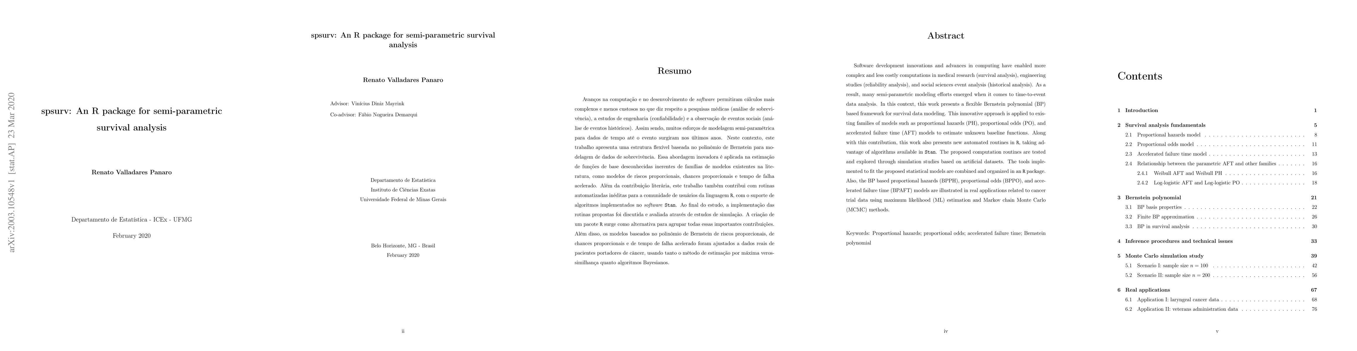 The spsurv R package introduces a flexible Bernstein polynomial framework for semi-parametric survival analysis, implementing BPPH, BPPO, and BPAFT models. It utilizes automated routines in R, leveraging Stan algorithms, and is validated through simulation and real-world cancer trial data applications.