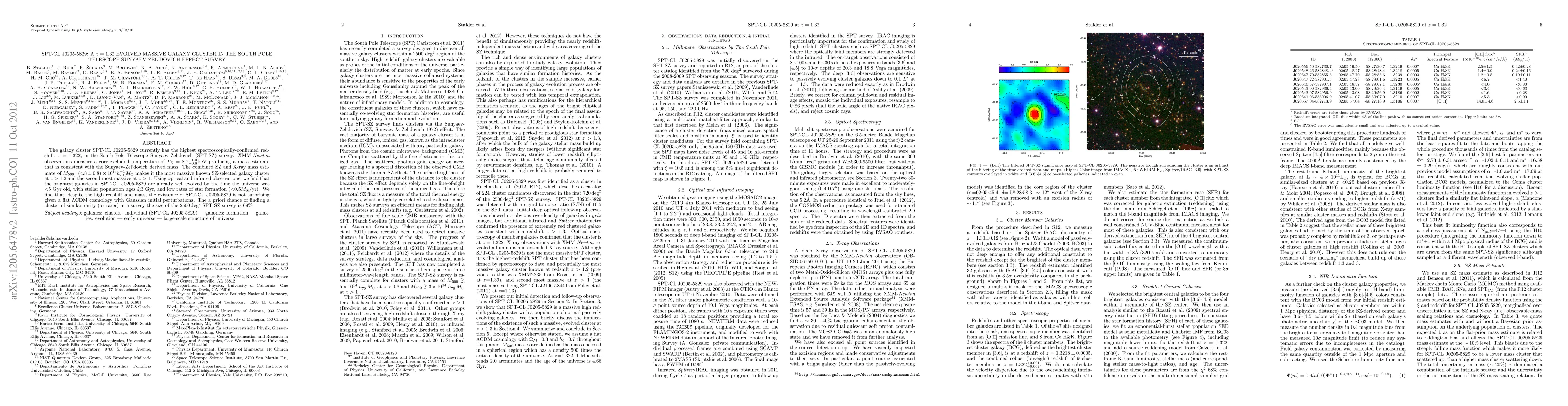 The galaxy cluster SPT-CL J0205-5829 currently has the highest spectroscopically-confirmed redshift, z=1.322, in the South Pole Telescope Sunyaev-Zel'dovich (SPT-SZ) survey. XMM-Newton observations measure a core-excluded temperature of Tx=8.7keV producing a mass estimate that is consistent with the Sunyaev-Zel'dovich derived mass. The combined SZ and X-ray mass estimate of M500=(4.9+/-0.8)e14 h_{70}^{-1} Msun makes it the most massive known SZ-selected galaxy cluster at z>1.2 and the second most massive at z>1. Using optical and infrared observations, we find that the brightest galaxies in SPT-CL J0205-5829 are already well evolved by the time the universe was <5 Gyr old, with stellar population ages >3 Gyr, and low rates of star formation (<0.5Msun/yr). We find that, despite the high redshift and mass, the existence of SPT-CL J0205-5829 is not surprising given a flat LambdaCDM cosmology with Gaussian initial perturbations. The a priori chance of finding a cluster of similar rarity (or rarer) in a survey the size of the 2500 deg^2 SPT-SZ survey is 69%.