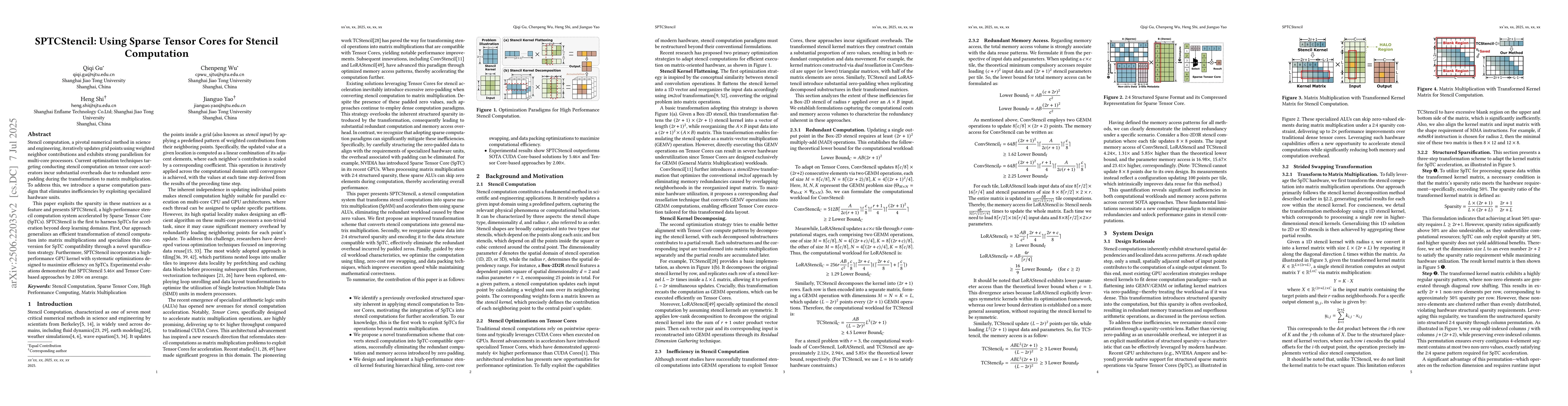 Stencil computation, a pivotal numerical method in science and engineering, iteratively updates grid points using weighted neighbor contributions and exhibits strong parallelism for multi-core processors. Current optimization techniques targeting conducting stencil computation on tensor core accelerators incur substantial overheads due to redundant zero-padding during the transformation to matrix multiplication. To address this, we introduce a sparse computation paradigm that eliminates inefficiencies by exploiting specialized hardware units. This paper exploits the sparsity in these matrices as a feature and presents SPTCStencil, a high-performance stencil computation system accelerated by Sparse Tensor Core (SpTCs). SPTCStencil is the first to harness SpTCs for acceleration beyond deep learning domains. First, Our approach generalizes an efficient transformation of stencil computation into matrix multiplications and specializes this conversion for SpTC compatibility through a novel sparsification strategy. Furthermore, SPTCStencil incorporates a high-performance GPU kernel with systematic optimizations designed to maximize efficiency on SpTCs. Experimental evaluations demonstrate that SPTCStencil 5.46$\times$ and Tensor Core-based approaches by 2.00$\times$ on average.