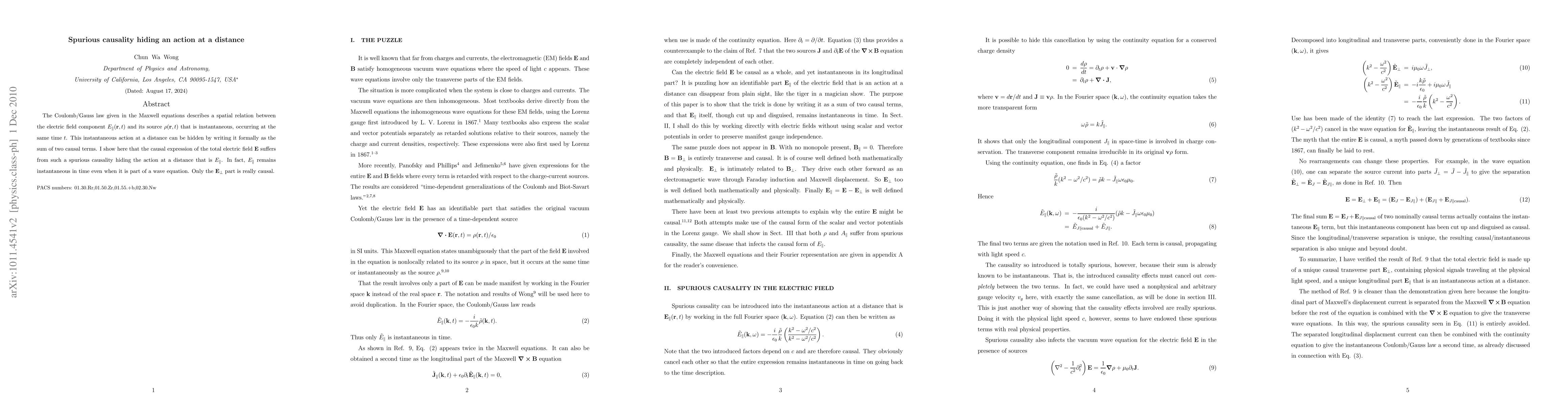 The Coulomb/Gauss law given in the Maxwell equations describes a spatial relation between the electric field component $E_\parallel({\bf r}, t)$ and its source $\rho({\bf r}, t)$ that is instantaneous, occurring at the same time $t$. This instantaneous action at a distance can be hidden by writing it formally as the sum of two causal terms. I show here that the causal expression of the total electric field ${\bf E}$ suffers from such a spurious causality hiding the action at a distance that is $E_\parallel$. In fact, $E_\parallel$ remains instantaneous in time even when it is part of a wave equation. Only the ${\bf E}_\perp$ part is really causal.