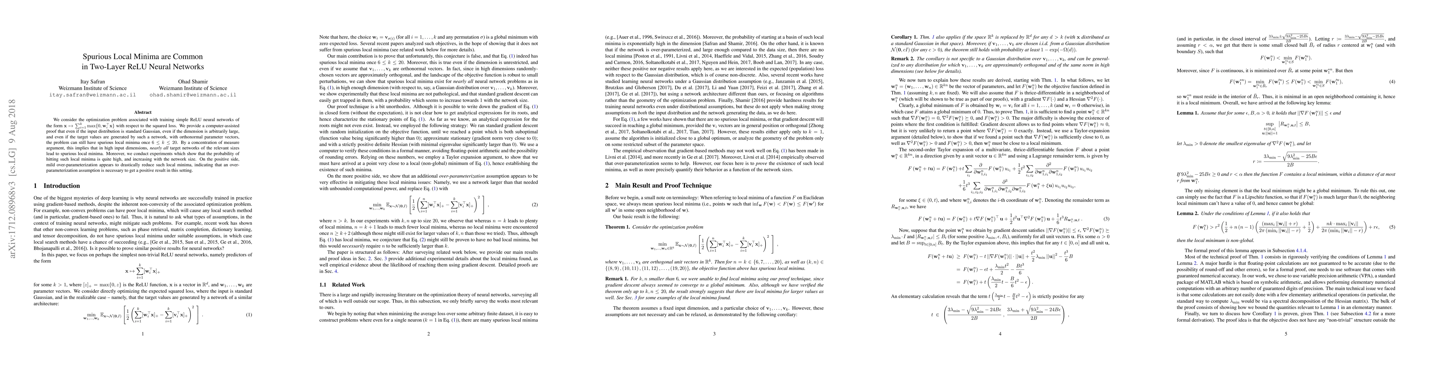 We consider the optimization problem associated with training simple ReLU neural networks of the form $\mathbf{x}\mapsto \sum_{i=1}^{k}\max\{0,\mathbf{w}_i^\top \mathbf{x}\}$ with respect to the squared loss. We provide a computer-assisted proof that even if the input distribution is standard Gaussian, even if the dimension is arbitrarily large, and even if the target values are generated by such a network, with orthonormal parameter vectors, the problem can still have spurious local minima once $6\le k\le 20$. By a concentration of measure argument, this implies that in high input dimensions, \emph{nearly all} target networks of the relevant sizes lead to spurious local minima. Moreover, we conduct experiments which show that the probability of hitting such local minima is quite high, and increasing with the network size. On the positive side, mild over-parameterization appears to drastically reduce such local minima, indicating that an over-parameterization assumption is necessary to get a positive result in this setting.