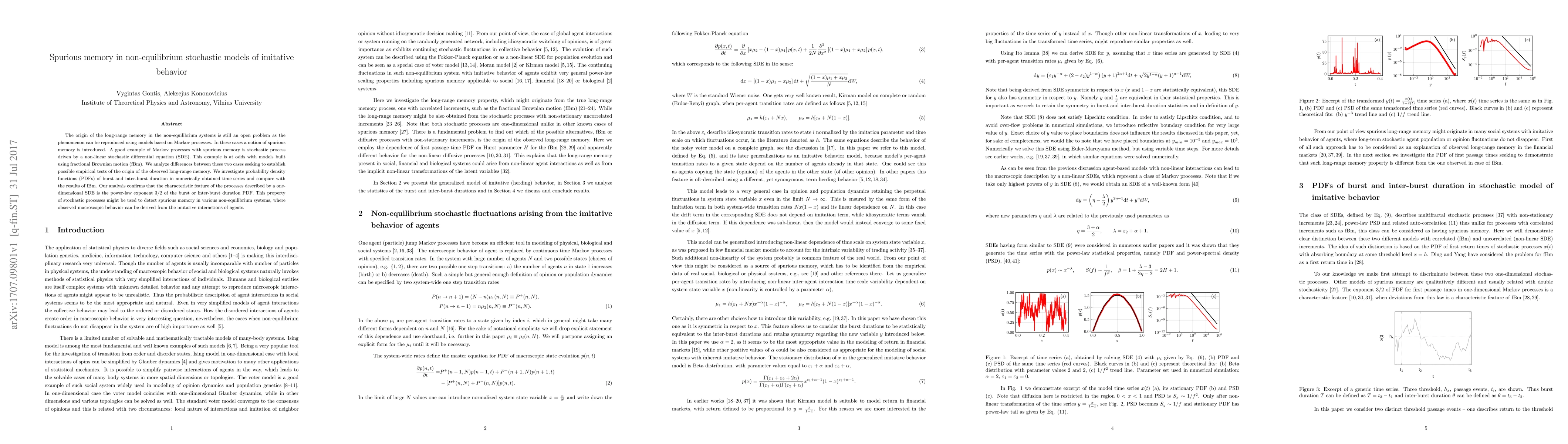 Researchers investigate spurious memory in non-equilibrium stochastic models of imitative behavior, finding that burst duration PDFs follow a power-law exponent $3/2$ for processes described by one-dimensional SDEs, which could be used to detect spurious memory.