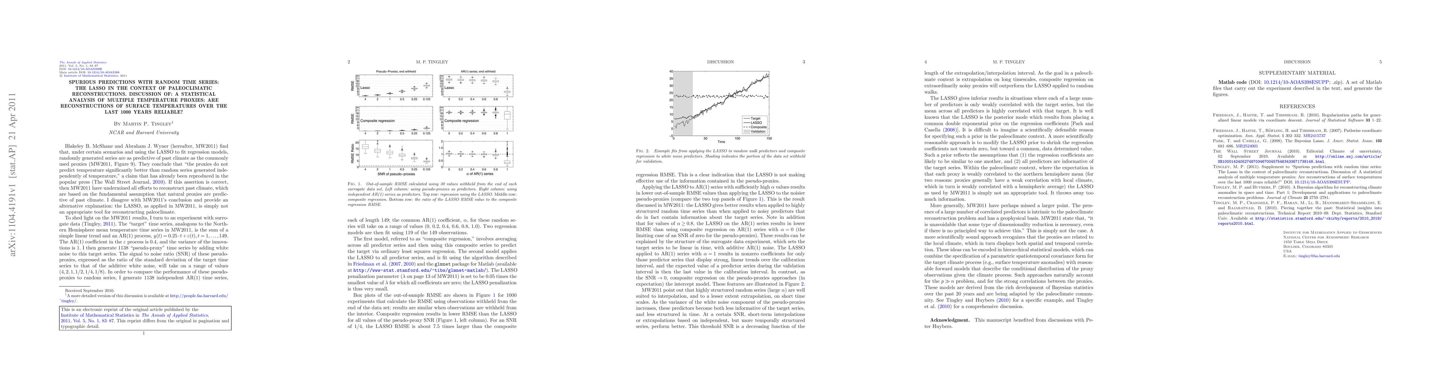 This paper discusses the reliability of paleoclimatic reconstructions using multiple temperature proxies, highlighting the risk of spurious predictions when employing the Lasso method for analyzing random time series data. It emphasizes the importance of statistical rigor in validating historical temperature reconstructions.