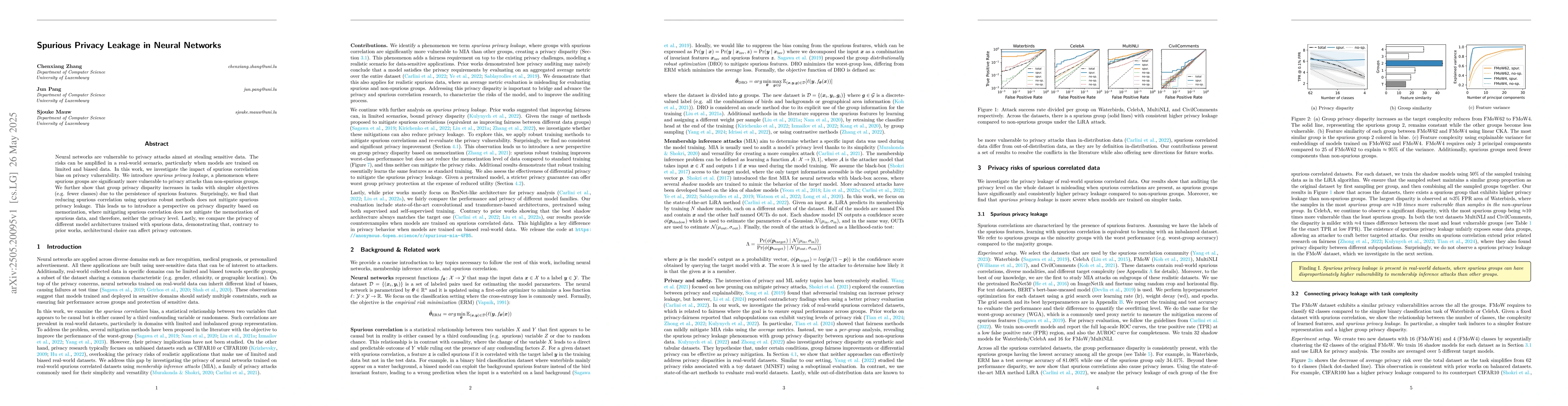 The paper investigates spurious privacy leakage in neural networks by examining the impact of spurious correlation bias on privacy vulnerability, comparing different model architectures, and employing spurious robust methods.