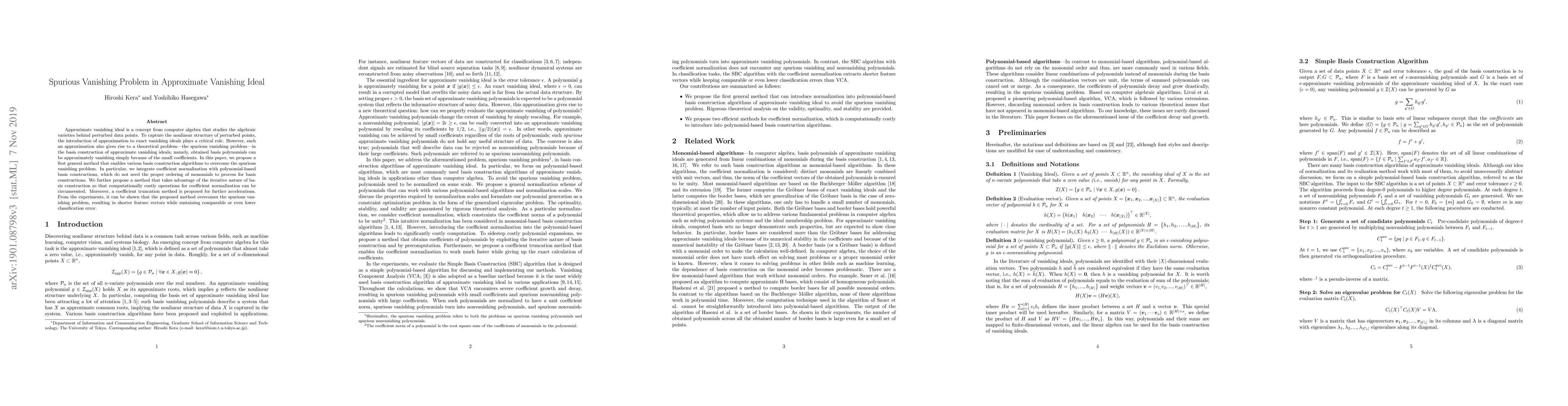 This paper addresses the spurious vanishing problem in approximate vanishing ideals, proposing a method that integrates coefficient normalization and iterative basis construction to overcome it. The approach avoids computationally expensive coefficient normalization and includes a coefficient truncation method for further efficiency, demonstrating improved performance in feature vector length and classification accuracy.