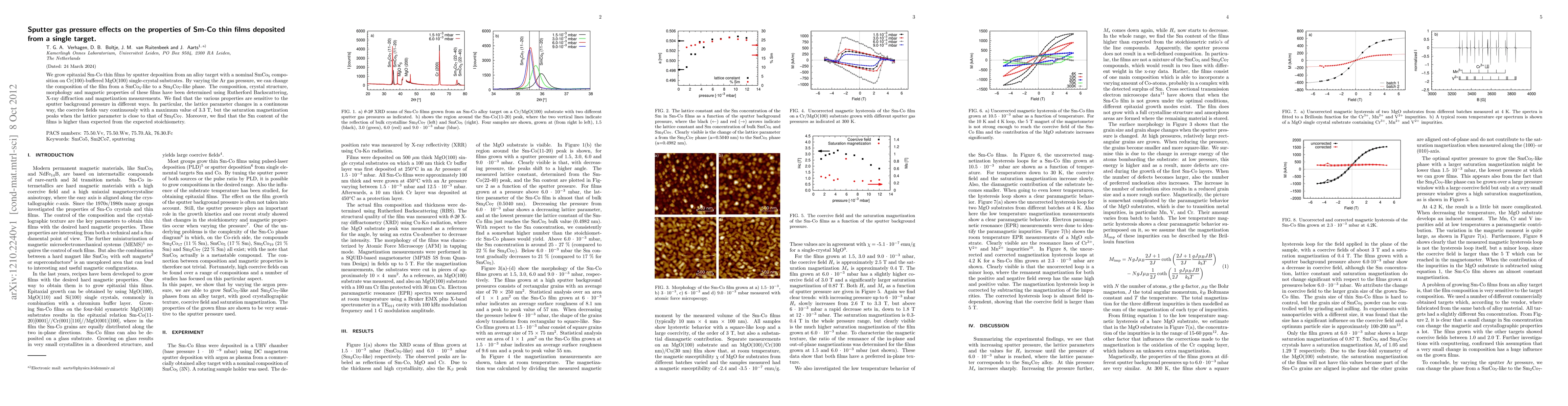 This study investigates how varying sputter gas pressure affects the properties of Sm-Co thin films deposited from an alloy target on Cr(100)-buffered MgO(100) substrates. The results show that the film composition, crystal structure, and magnetic properties, including lattice parameters and coercive fields, are sensitive to the background pressure, with saturation magnetization peaking near the Sm2Co7 lattice parameter.