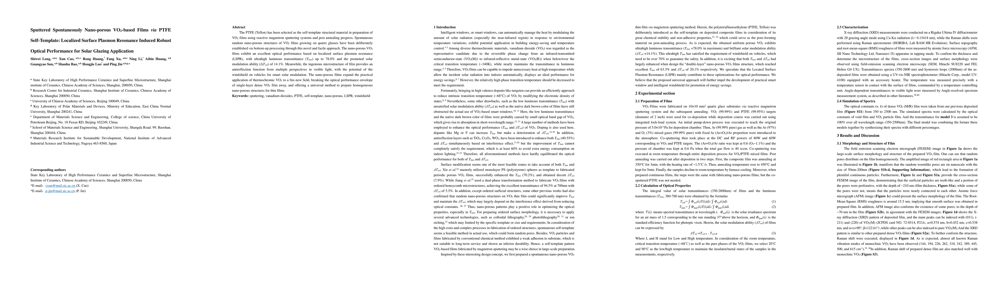 This paper presents a novel method for creating sputtered, nano-porous VO2 films using PTFE as a self-template, which results in enhanced optical performance via localized surface plasmon resonance. The films achieve high luminous transmittance and solar modulation ability, offering potential for smart solar glazing applications.