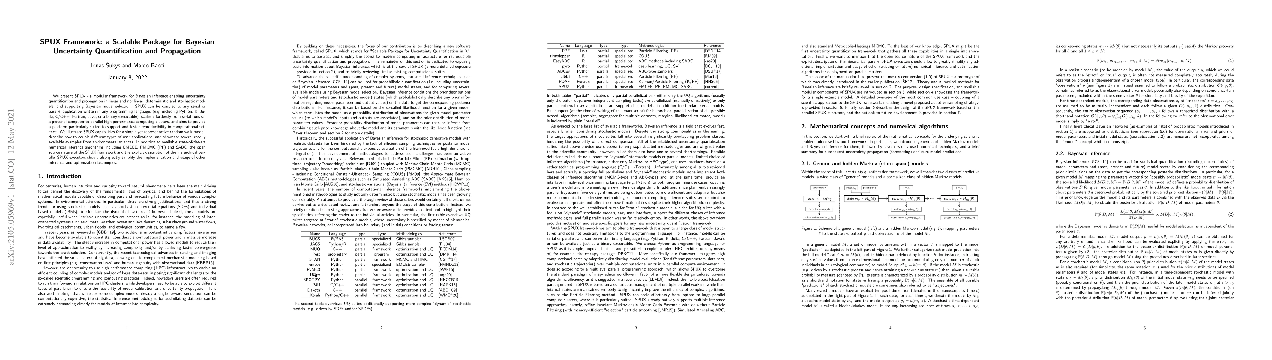 We present SPUX - a modular framework for Bayesian inference enabling uncertainty quantification and propagation in linear and nonlinear, deterministic and stochastic models, and supporting Bayesian model selection. SPUX can be coupled to any serial or parallel application written in any programming language, (e.g. including Python, R, Julia, C/C++, Fortran, Java, or a binary executable), scales effortlessly from serial runs on a personal computer to parallel high performance computing clusters, and aims to provide a platform particularly suited to support and foster reproducibility in computational science. We illustrate SPUX capabilities for a simple yet representative random walk model, describe how to couple different types of user applications, and showcase several readily available examples from environmental sciences. In addition to available state-of-the-art numerical inference algorithms including EMCEE, PMCMC (PF) and SABC, the open source nature of the SPUX framework and the explicit description of the hierarchical parallel SPUX executors should also greatly simplify the implementation and usage of other inference and optimization techniques.