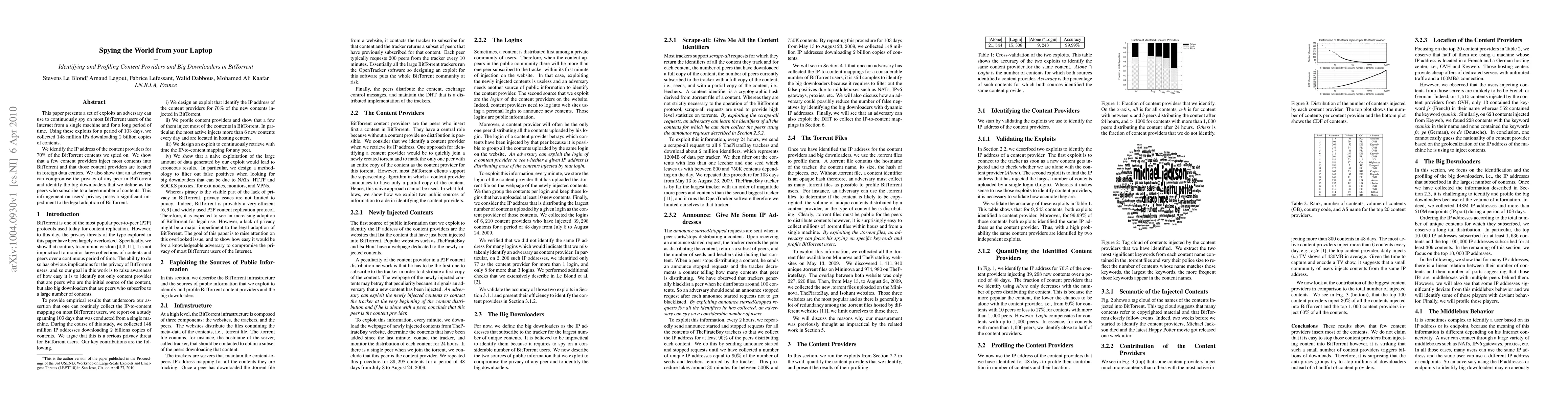 This paper details methods for spying on BitTorrent users, revealing that adversaries can identify content providers and large downloaders, compromising user privacy and highlighting the dominance of a few foreign data centers in content distribution. The findings pose challenges for the legal acceptance of BitTorrent.