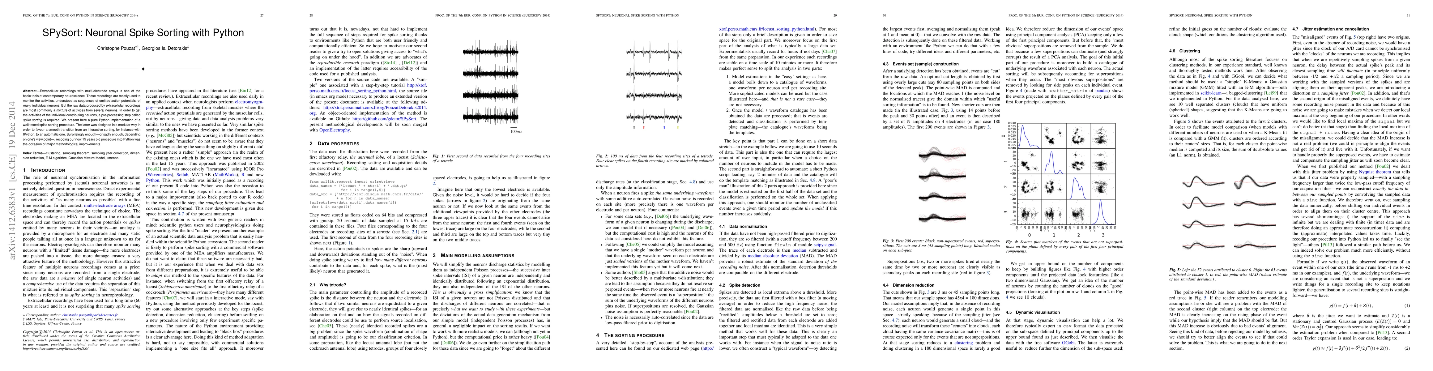 SPySort is a Python-based implementation of a spike sorting procedure for analyzing extracellular recordings from multi-electrode arrays. The modular design facilitates both interactive and automatic sorting, and the transition to Python led to significant methodological enhancements.