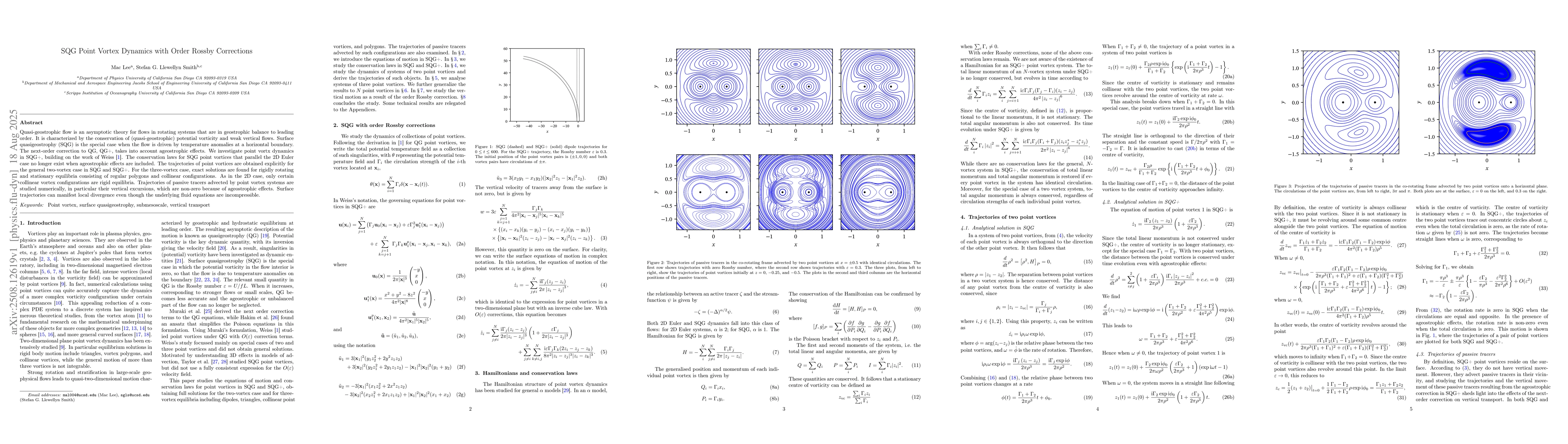 Quasi-geostrophic flow is an asymptotic theory for flows in rotating systems that are in geostrophic balance to leading order. It is characterized by the conservation of (quasi-geostrophic) potential vorticity and weak vertical flows. Surface quasigeostrophy (SQG) is the special case when the flow is driven by temperature anomalies at a horizontal boundary. The next-order correction to QG, QG+, takes into account ageostrophic effects. We investigate point vortx dynamics in SQG+, building on the work of Weiss. The conservation laws for SQG point vortices that parallel the 2D Euler case no longer exist when ageostrophic effects are included. The trajectories of point vortices are obtained explicitly for the general two-vortex case in SQG and SQG+. For the three-vortex case, exact solutions are found for rigidly rotating and stationary equilibria consisting of regular polygons and collinear configurations. As in the 2D case, only certain collinear vortex configurations are rigid equilibria. Trajectories of passive tracers advected by point vortex systems are studied numerically, in particular their vertical excursions, which are non-zero because of ageostrophic effects. Surface trajectories can manifest local divergence even though the underlying fluid equations are incompressible.
