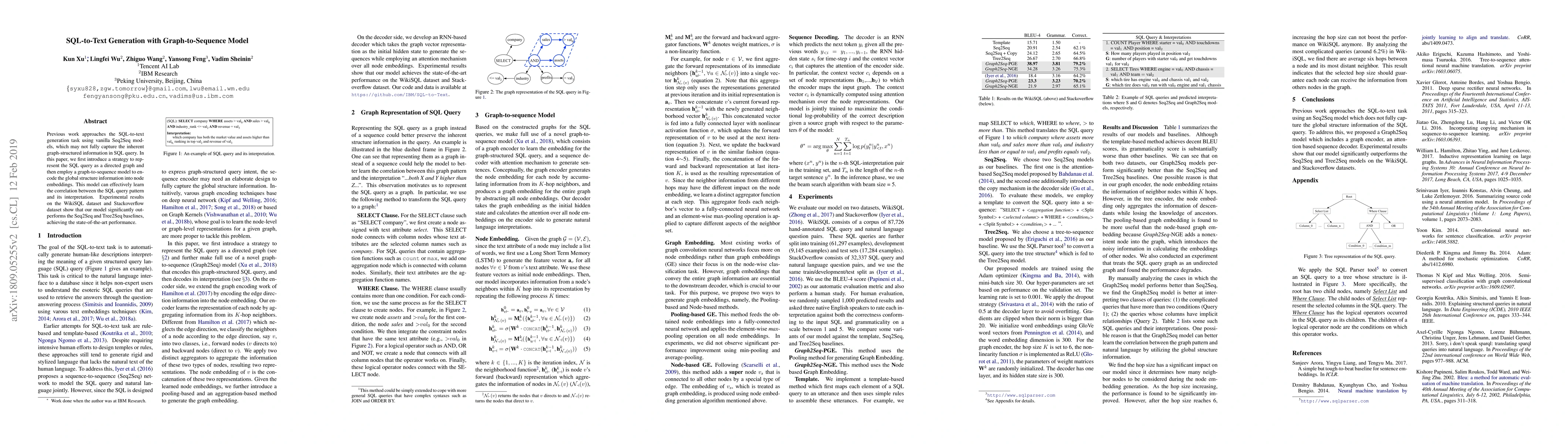 This paper proposes a graph-to-sequence model for SQL-to-text generation, representing SQL queries as directed graphs to capture their structural information. The model outperforms traditional Seq2Seq and Tree2Seq baselines, achieving state-of-the-art results on WikiSQL and Stackoverflow datasets.