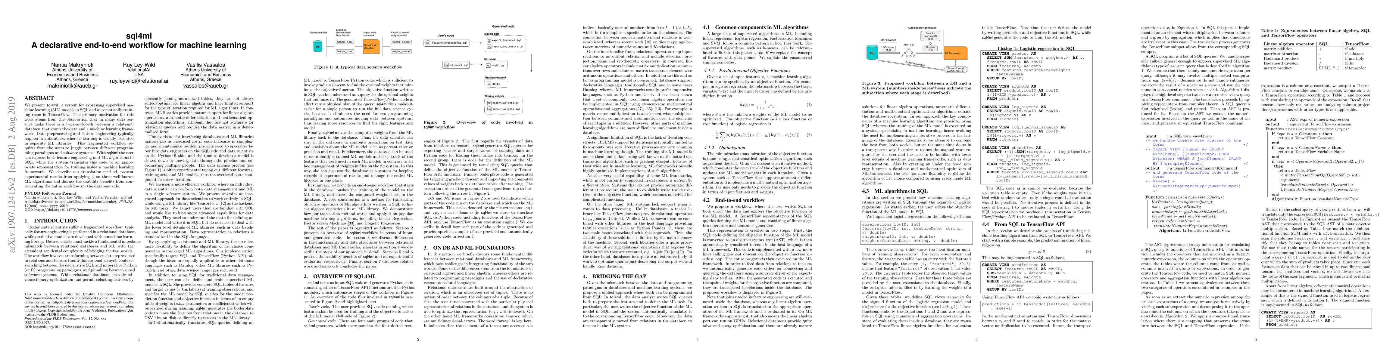 sql4ml enables users to express supervised machine learning models in SQL, automatically translating them for training in TensorFlow. This approach consolidates feature engineering and ML algorithms within a single relational database workflow, reducing the need for switching between different programming paradigms and systems.