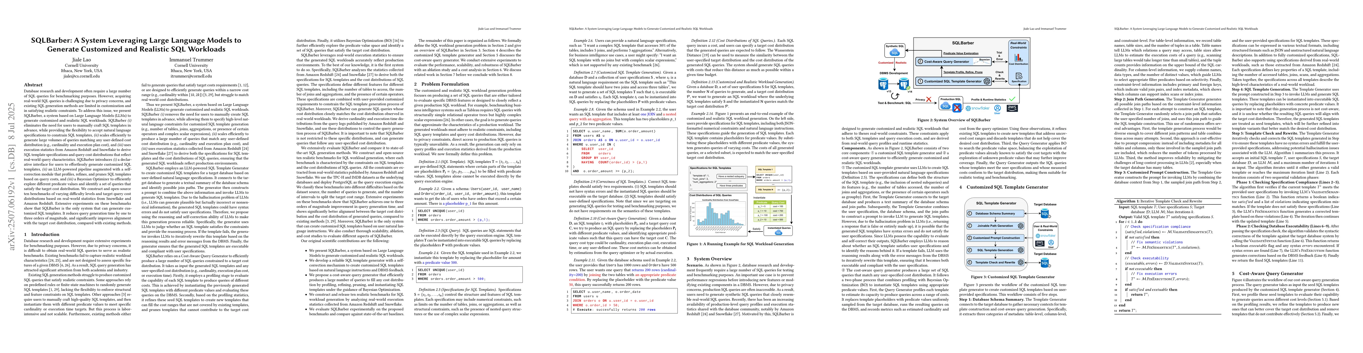 Database research and development often require a large number of SQL queries for benchmarking purposes. However, acquiring real-world SQL queries is challenging due to privacy concerns, and existing SQL generation methods are limited in customization and in satisfying realistic constraints. To address this issue, we present SQLBarber, a system based on Large Language Models (LLMs) to generate customized and realistic SQL workloads. SQLBarber (i) eliminates the need for users to manually craft SQL templates in advance, while providing the flexibility to accept natural language specifications to constrain SQL templates, (ii) scales efficiently to generate large volumes of queries matching any user-defined cost distribution (e.g., cardinality and execution plan cost), and (iii) uses execution statistics from Amazon Redshift and Snowflake to derive SQL template specifications and query cost distributions that reflect real-world query characteristics. SQLBarber introduces (i) a declarative interface for users to effortlessly generate customized SQL templates, (ii) an LLM-powered pipeline augmented with a self-correction module that profiles, refines, and prunes SQL templates based on query costs, and (iii) a Bayesian Optimizer to efficiently explore different predicate values and identify a set of queries that satisfy the target cost distribution. We construct and open-source ten benchmarks of varying difficulty levels and target query cost distributions based on real-world statistics from Snowflake and Amazon Redshift. Extensive experiments on these benchmarks show that SQLBarber is the only system that can generate customized SQL templates. It reduces query generation time by one to three orders of magnitude, and significantly improves alignment with the target cost distribution, compared with existing methods.