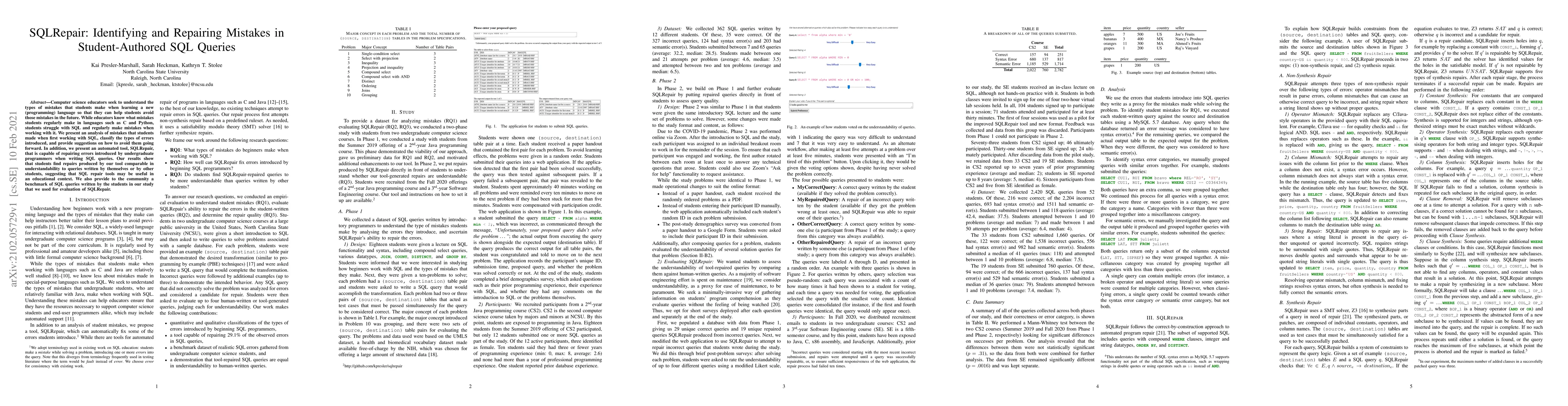 SQLRepair identifies and repairs common SQL mistakes made by students, offering insights into error types and suggesting improvements. The tool demonstrates effectiveness in producing understandable repairs, potentially aiding educators in teaching SQL.