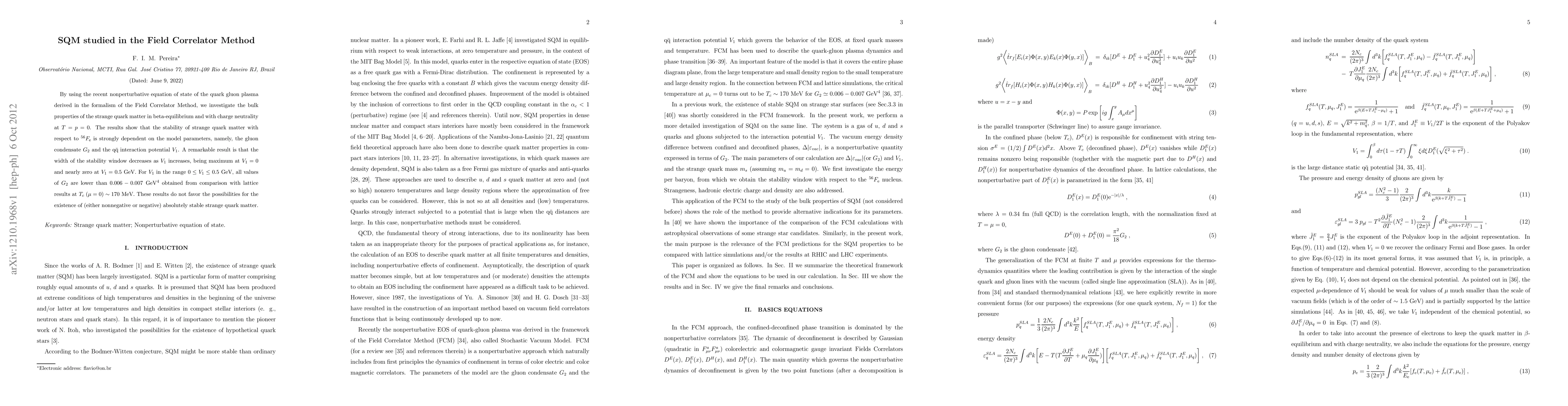 By using the recent nonperturbative equation of state of the quark gluon plasma derived in the formalism of the Field Correlator Method, we investigate the bulk properties of the strange quark matter in beta-equilibrium and with charge neutrality at T=p=0. The results show that the stability of strange quark matter with respect to $^{56}Fe$ is strongly dependent on the model parameters, namely, the gluon condensate $G_2$ and the q$\bar{\rm q}$ interaction potential $V_1$. A remarkable result is that the width of the stability window decreases as $V_1$ increases, being maximum at $V_1=0$ and nearly zero at $V_1=0.5$ GeV. For $V_1$ in the range $0\leq V_1\leq0.5$ GeV, all values of $G_2$ are lower than $0.006-0.007\;{\rm GeV}^4$ obtained from comparison with lattice results at $T_c\;(\mu=0)\sim170$ MeV. These results do not favor the possibilities for the existence of (either nonnegative or negative) absolutely stable strange quark matter.