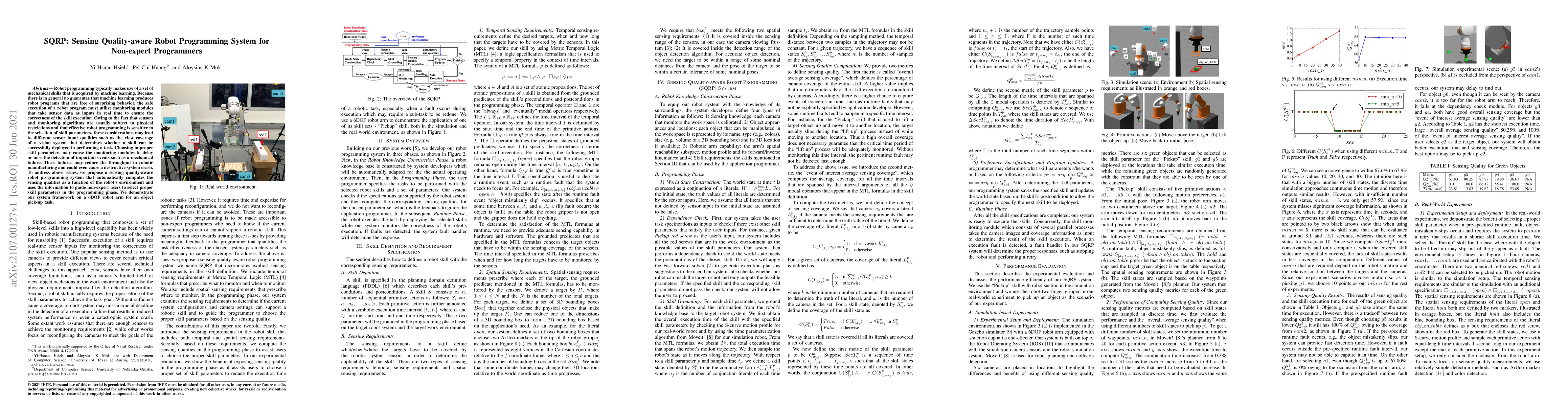 The paper proposes SQRP, a sensing quality-aware robot programming system to assist non-expert programmers by automatically computing sensor input qualities and guiding the selection of appropriate skill parameters to ensure safe and effective robot program execution. The system is demonstrated on a 6DOF robot arm performing an object pick-up task.