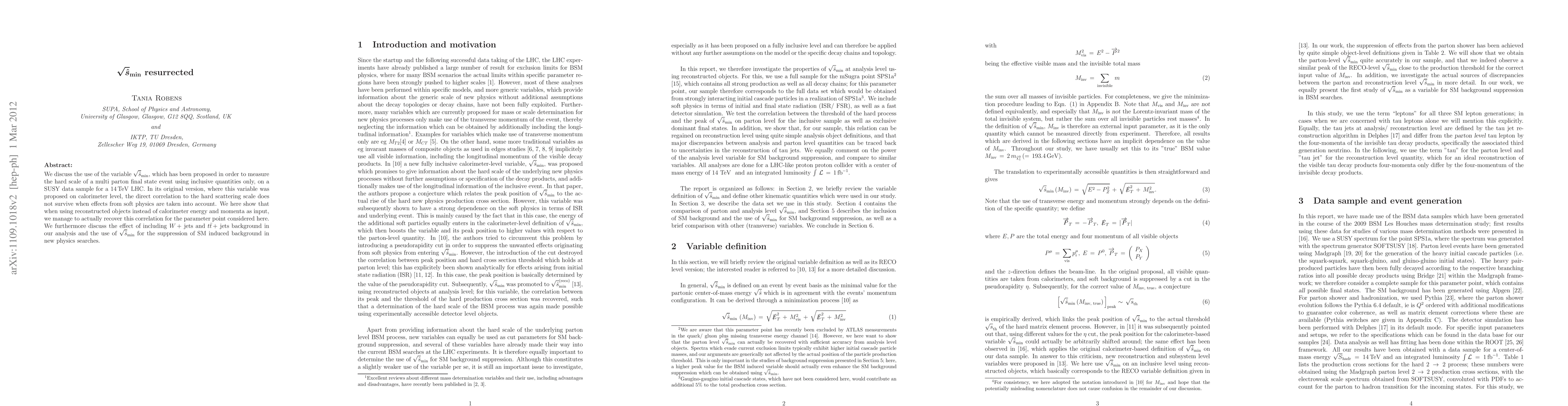 We discuss the use of the variable sqrt{shat}_{min}, which has been proposed in order to measure the hard scale of a multi parton final state event using inclusive quantities only, on a SUSY data sample for a 14 TeV LHC. In its original version, where this variable was proposed on calorimeter level, the direct correlation to the hard scattering scale does not survive when effects from soft physics are taken into account. We here show that when using reconstructed objects instead of calorimeter energy and momenta as input, we manage to actually recover this correlation for the parameter point considered here. We furthermore discuss the effect of including W + jets and t tbar+jets background in our analysis and the use of sqrt{shat}_{min} for the suppression of SM induced background in new physics searches.