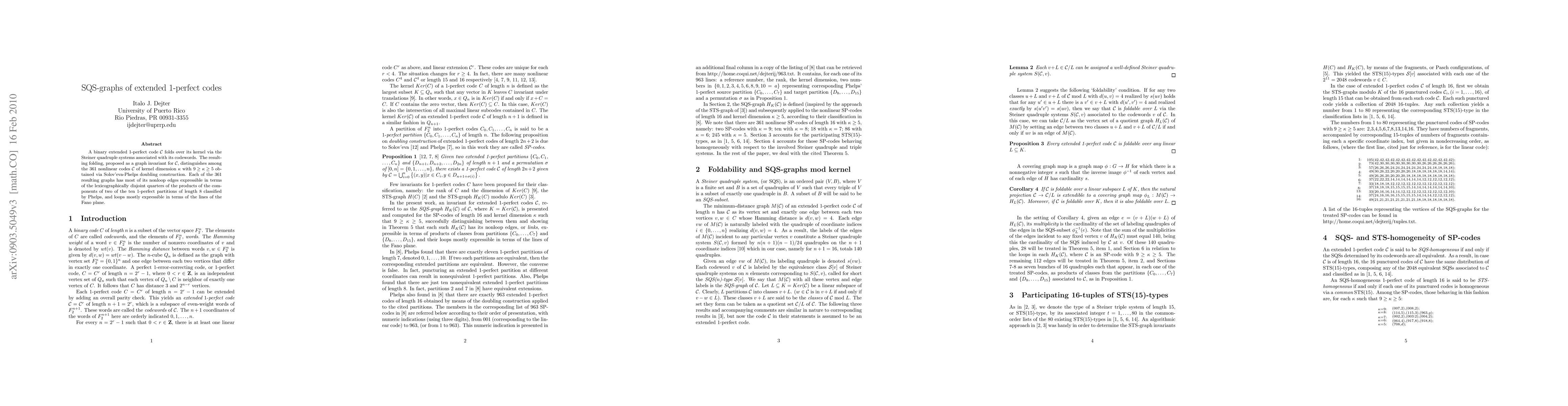 This paper introduces SQS-graphs as a graph invariant for binary extended 1-perfect codes, distinguishing among 361 nonlinear codes via Steiner quadruple systems. The graphs' edges are largely defined by disjoint code partitions, with loops related to Fano plane lines.