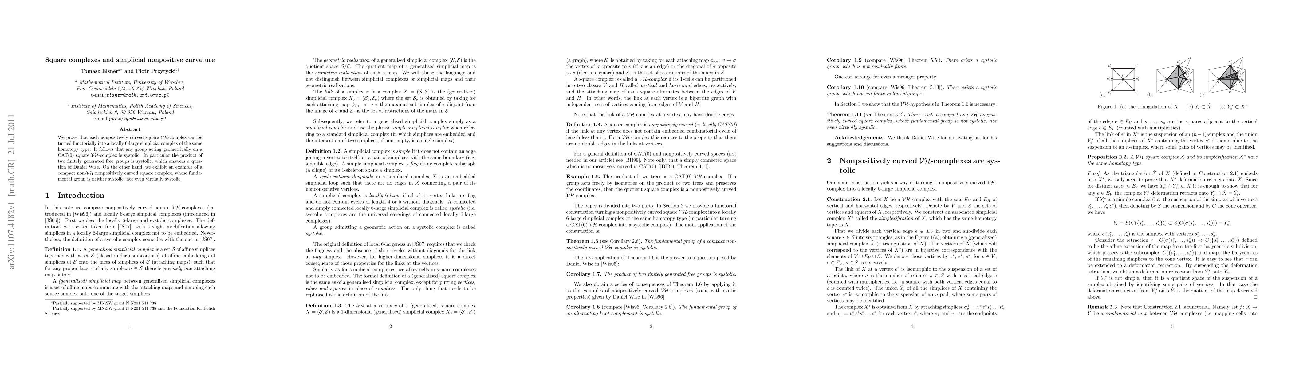 We prove that each nonpositively curved square VH-complex can be turned functorially into a locally 6-large simplicial complex of the same homotopy type. It follows that any group acting geometrically on a CAT(0) square VH-complex is systolic. In particular the product of two finitely generated free groups is systolic, which answers a question of Daniel Wise. On the other hand, we exhibit an example of a compact non-VH nonpositively curved square complex, whose fundamental group is neither systolic, nor even virtually systolic.