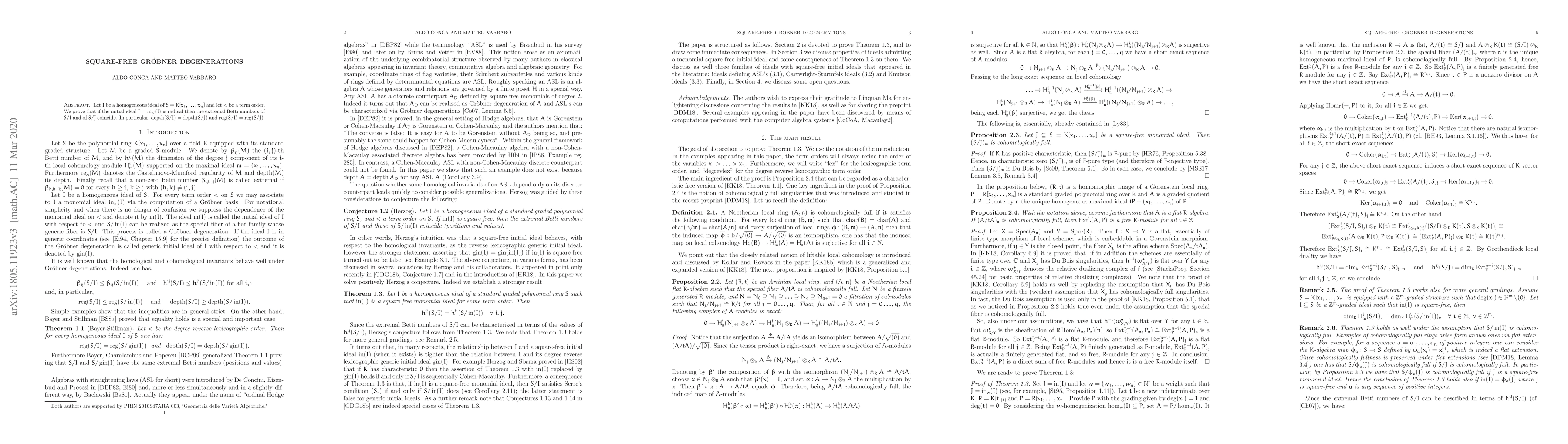 Let I be a homogeneous ideal of a polynomial ring S. We prove that if the initial ideal J of I, w.r.t. a term order on S, is square-free, then the extremal Betti numbers of S/I and of S/J coincide. In particular, depth(S/I)=depth(S/J) and reg(S/I)=reg(S/J).