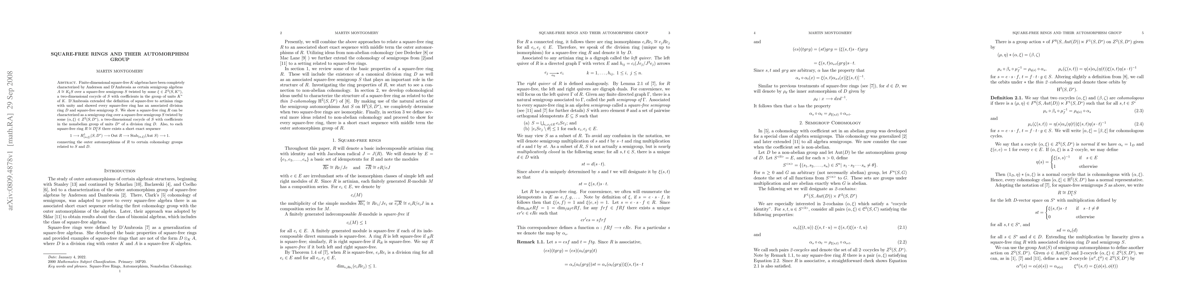 Finite-dimensional square-free algebras have been completely characterized by Anderson and D'Ambrosia as certain twisted semigroup algebras over a square-free semigroup S with coefficients in a field K. D'Ambrosia extended the definition of square-free to artinian rings with unity and showed every square-free ring has an associated division ring D and square-free semigroup S. We show a square-free ring can be characterized as a twisted semigroup ring over a square-free semigroup S with coefficients in a division ring D. Also, to each square-free ring there exists a short exact sequence connecting the outer automorphisms of a square-free ring to certain cohomology groups related to S and D.