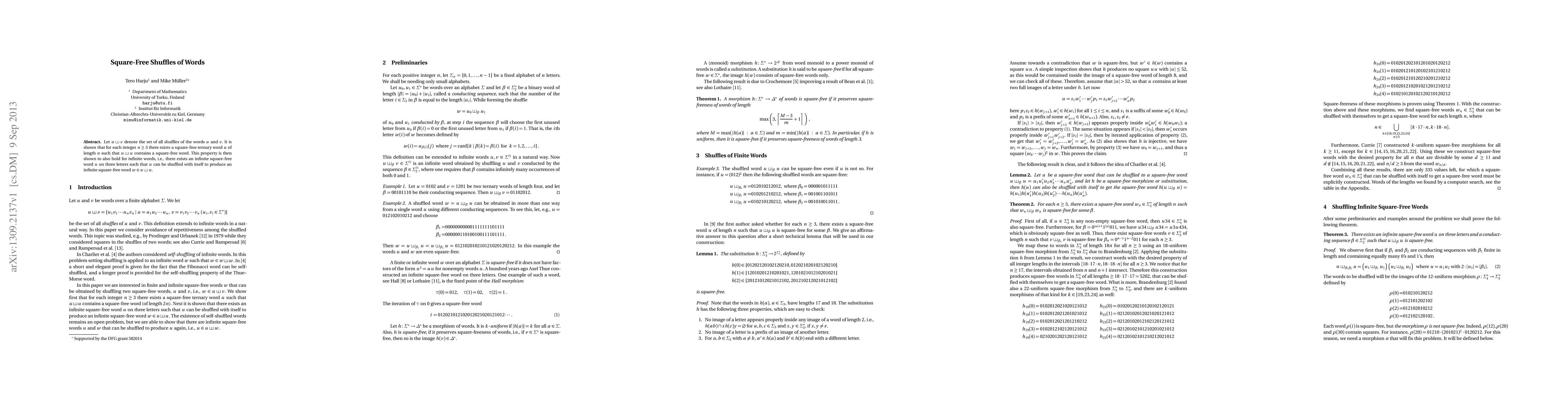 This paper demonstrates the existence of square-free ternary words of any length $n \geq 3$ whose shuffles with themselves contain square-free words, and extends this property to infinite square-free words.