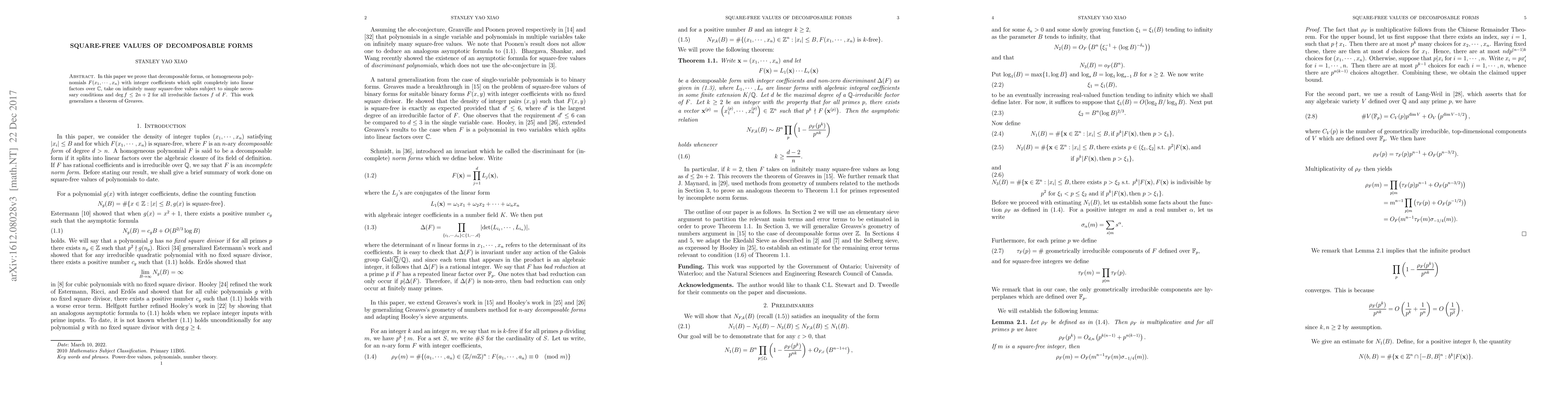 In this paper we prove that decomposable forms, or homogeneous polynomials $F(x_1, \cdots, x_n)$ with integer coefficients which split completely into linear factors over $\mathbb{C}$, take on infinitely many square-free values subject to simple necessary conditions and $\operatorname{deg} f \leq 2n + 2$ for all irreducible factors $f$ of $F$. This work generalizes a theorem of Greaves.