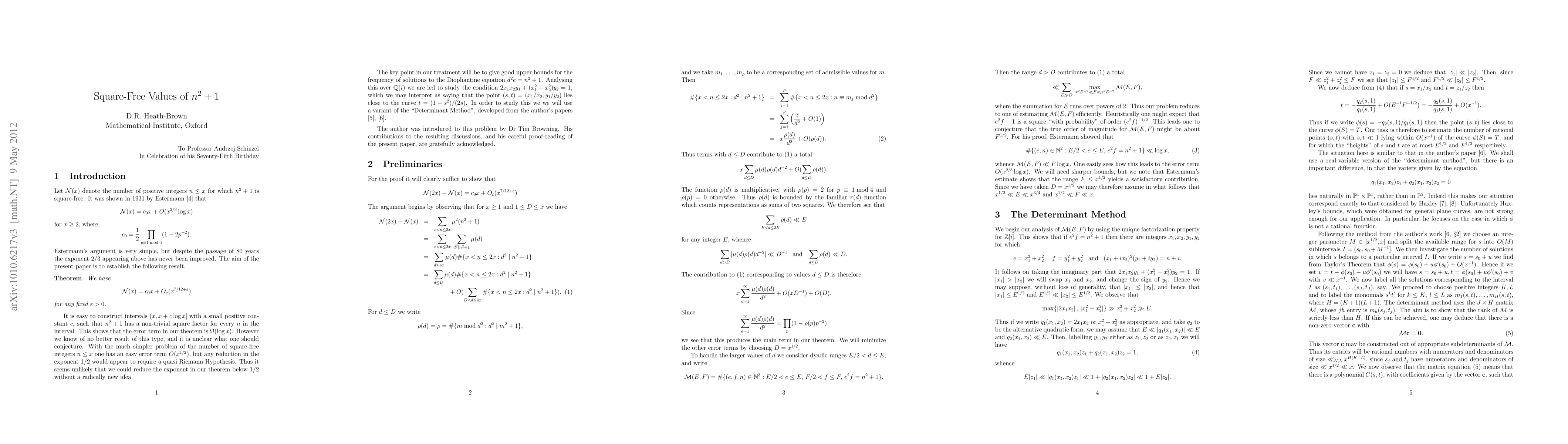 Researchers improved a 1931 result on the square-free values of $n^2+1$ by reducing the error term's exponent from 2/3 to 7/12, using a novel application of the determinant method for counting rational points near algebraic curves.