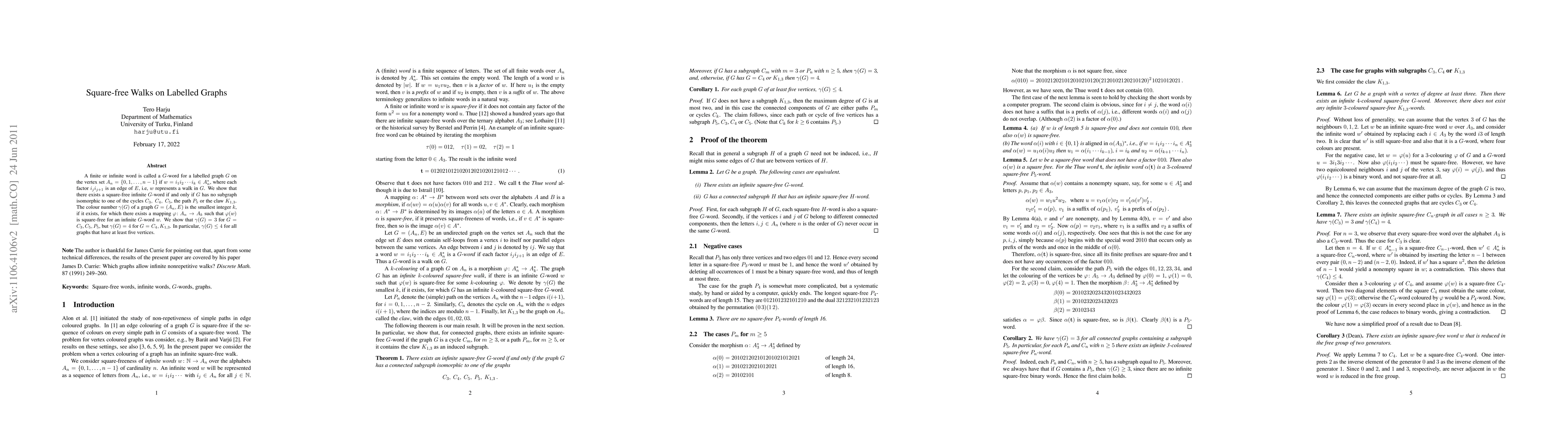 A finite or infinite word is called a $G$-word for a labelled graph $G$ on the vertex set $A_n = \{0,1,..., n-1\}$ if $w = i_1i_2...i_k \in A_n^*$, where each factor $i_ji_{j+1}$ is an edge of $E$, i.e, $w$ represents a walk in $G$. We show that there exists a square-free infinite $G$-word if and only if $G$ has no subgraph isomorphic to one of the cycles $C_3, \ C_4, \ C_5$, the path $P_5$ or the claw $K_{1,3}$. The colour number $\gamma(G)$ of a graph $G=(A_n,E)$ is the smallest integer $k$, if it exists, for which there exists a mapping $\phi\colon A_n \to A_k$ such that $\phi(w)$ is square-free for an infinite $G$-word $w$. We show that $\gamma(G)=3$ for $G=C_3, C_5, P_5$, but $\gamma(G)=4$ for $G=C_4, K_{1,3}$. In particular, $\gamma(G) \leq 4$ for all graphs that have at least five vertices.