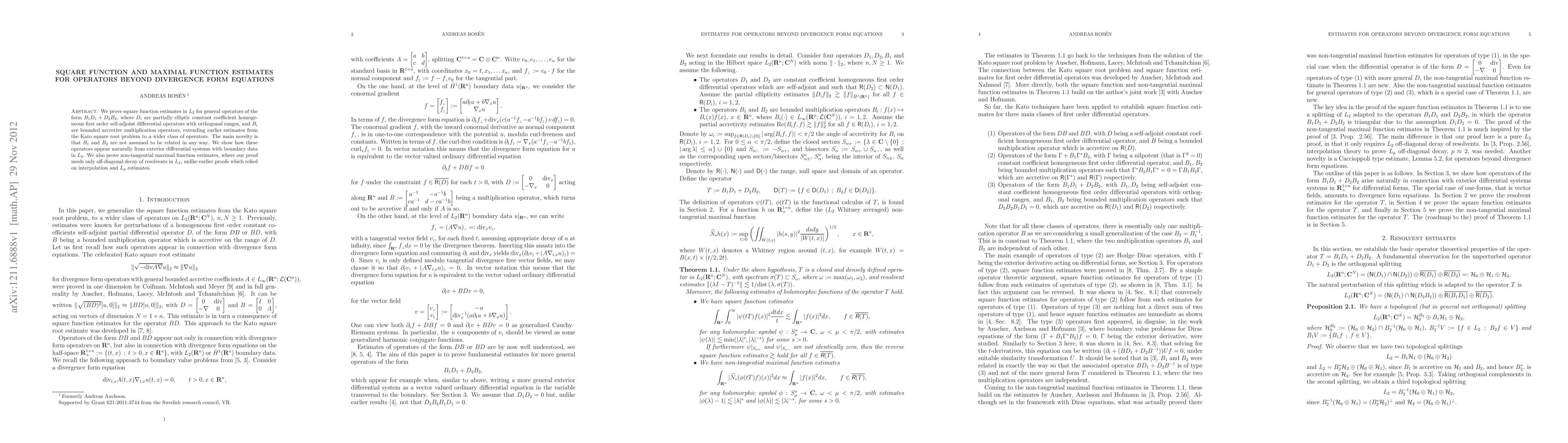 Researchers develop square function estimates for a class of operators beyond divergence form equations, extending earlier work on the Kato square root problem to include more general operators with unrelated bounded accretive multiplication operators.