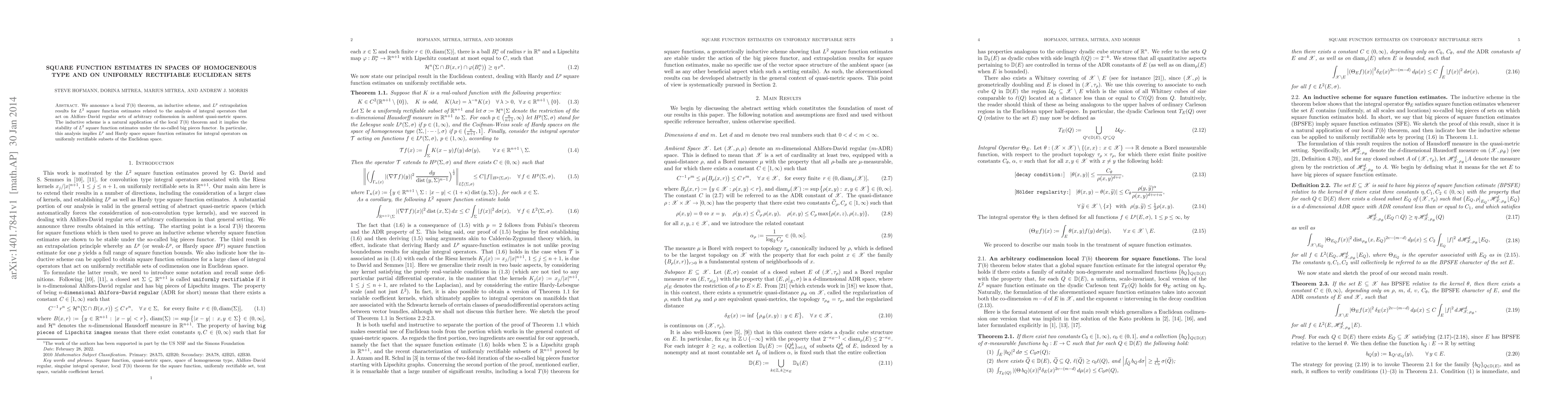 We announce a local $T(b)$ theorem, an inductive scheme, and $L^p$ extrapolation results for $L^2$ square function estimates related to the analysis of integral operators that act on Ahlfors-David regular sets of arbitrary codimension in ambient quasi-metric spaces. The inductive scheme is a natural application of the local $T(b)$ theorem and it implies the stability of $L^2$ square function estimates under the so-called big pieces functor. In particular, this analysis implies $L^p$ and Hardy space square function estimates for integral operators on uniformly rectifiable subsets of the Euclidean space.